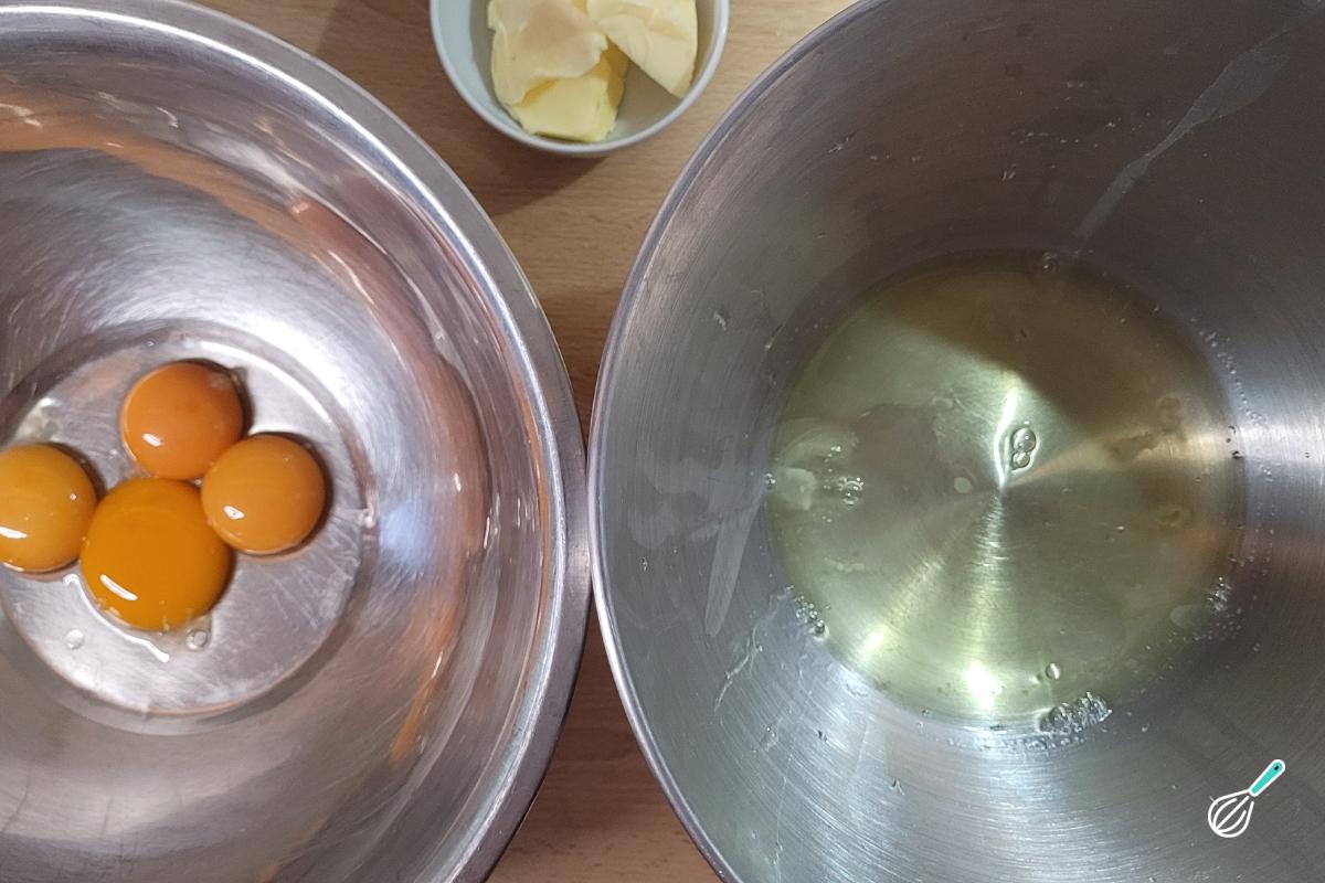 Separe as claras das gemas. Coloque as claras na tigela da batedeira e as gemas em uma tigela grande onde irá misturar toda a massa do bolo.