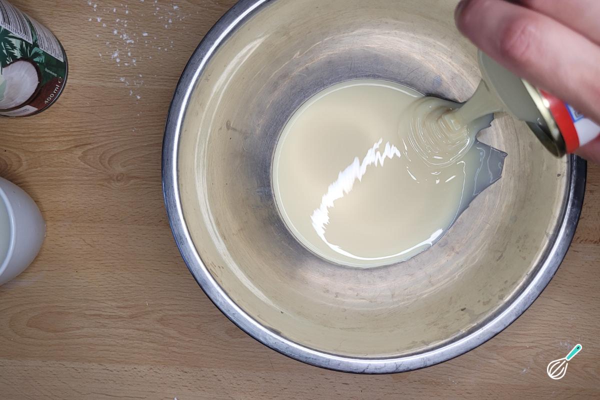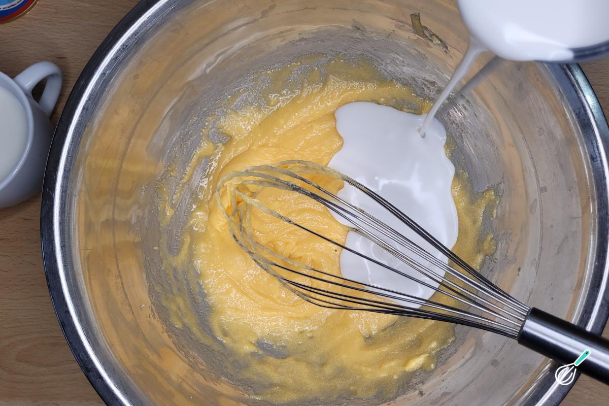 Bata muito bem com um batedor de arame até ter uma mistura bem aerada e de cor mais clara. Adicione o leite de coco e o leite e misture.