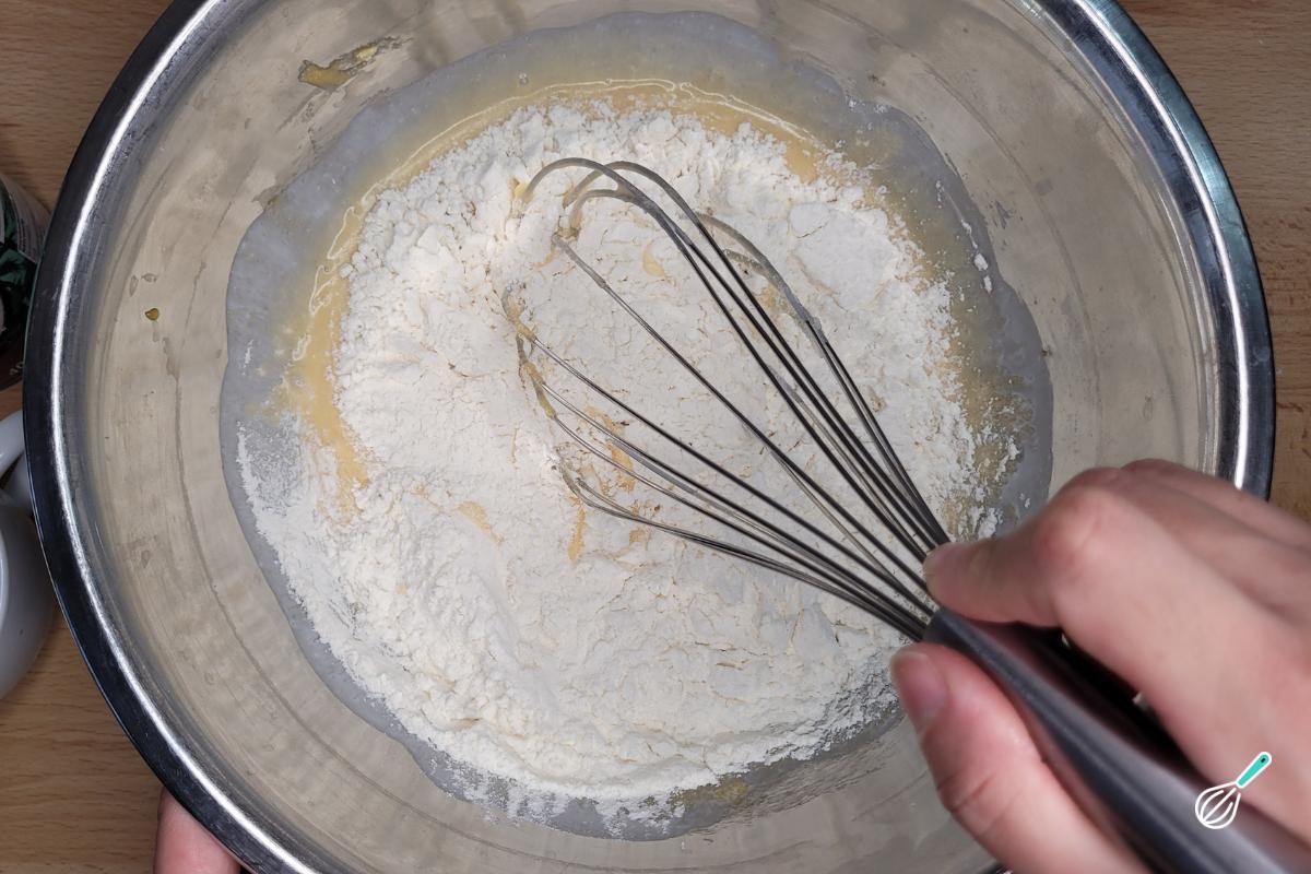 Acrescente a farinha e misture bem até a massa ficar homogênea, mas evite bater demais para a massa não ficar pesada. O fermento será acrescentado depois