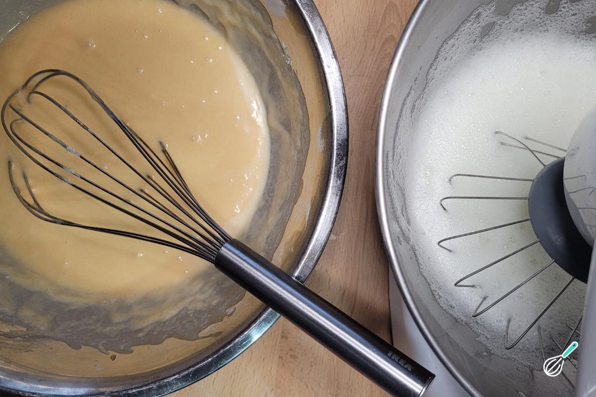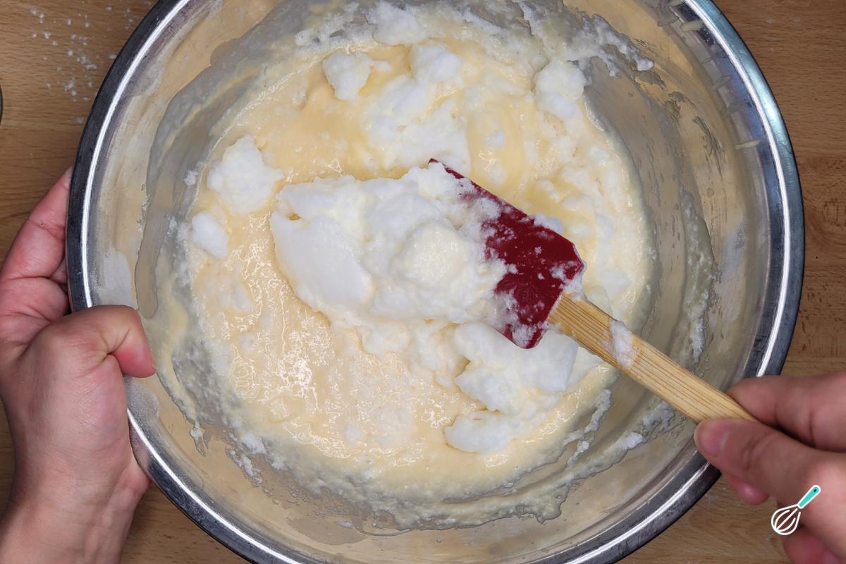 Incorpore as claras em neve à massa pouco a pouco com uma espátula, mexendo de baixo para cima para não oerder a aeração.