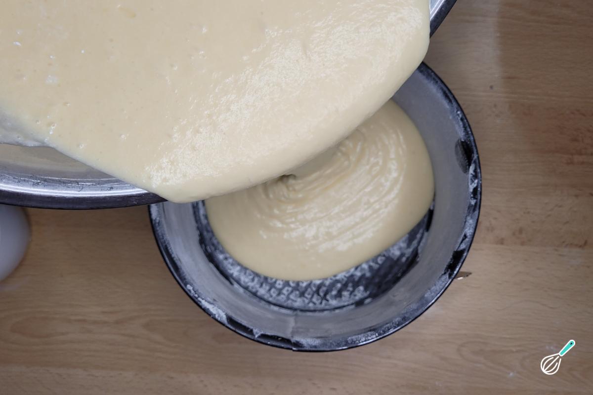 Despeje a massa em uma forma untada e enfarinhada e leve ao forno pré-aquecido a 180oC até que o bolo esteja assado.
