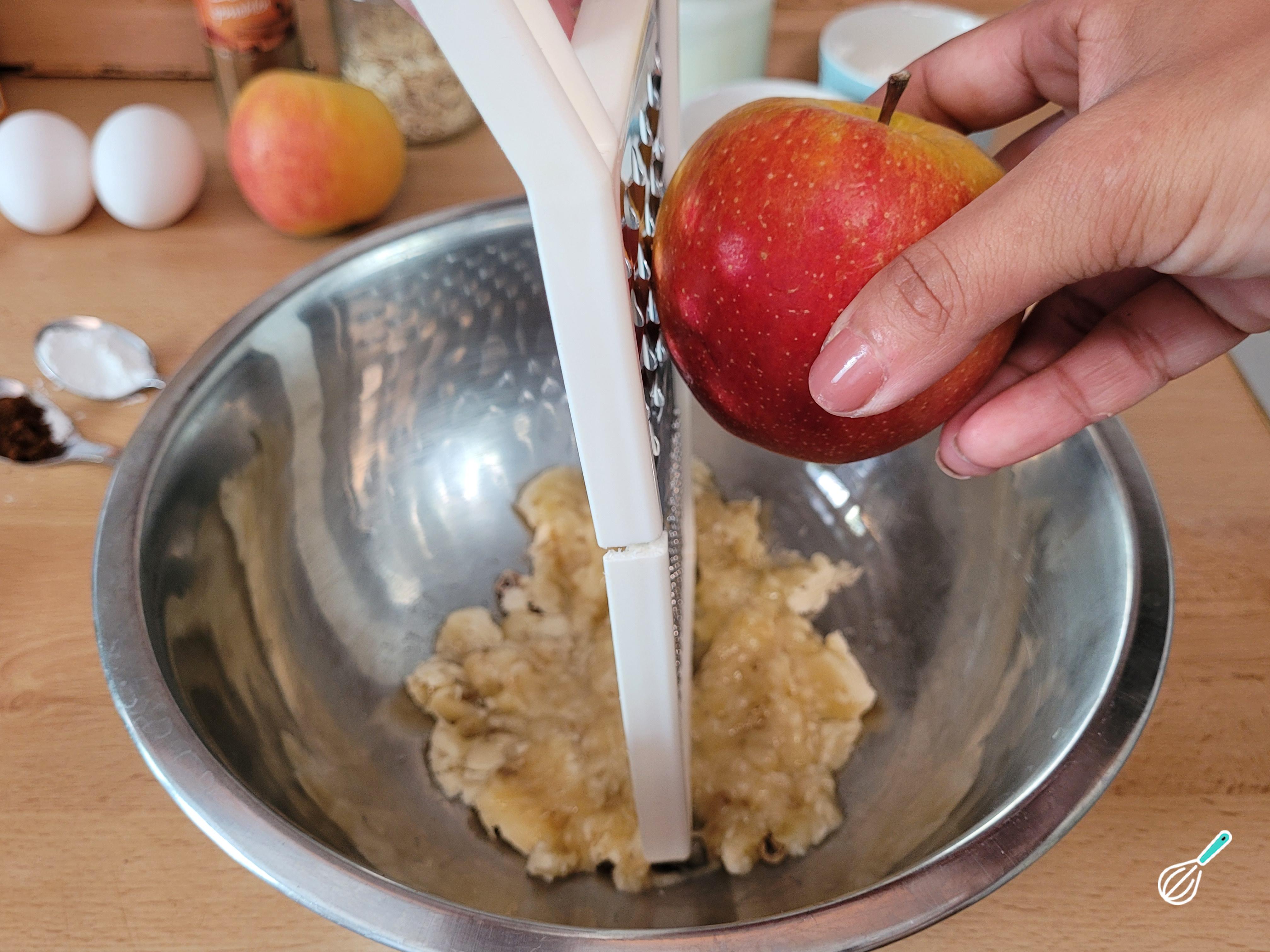 Em uma tigela, amasse a banana e rale uma das maçãs com casca mesmo.