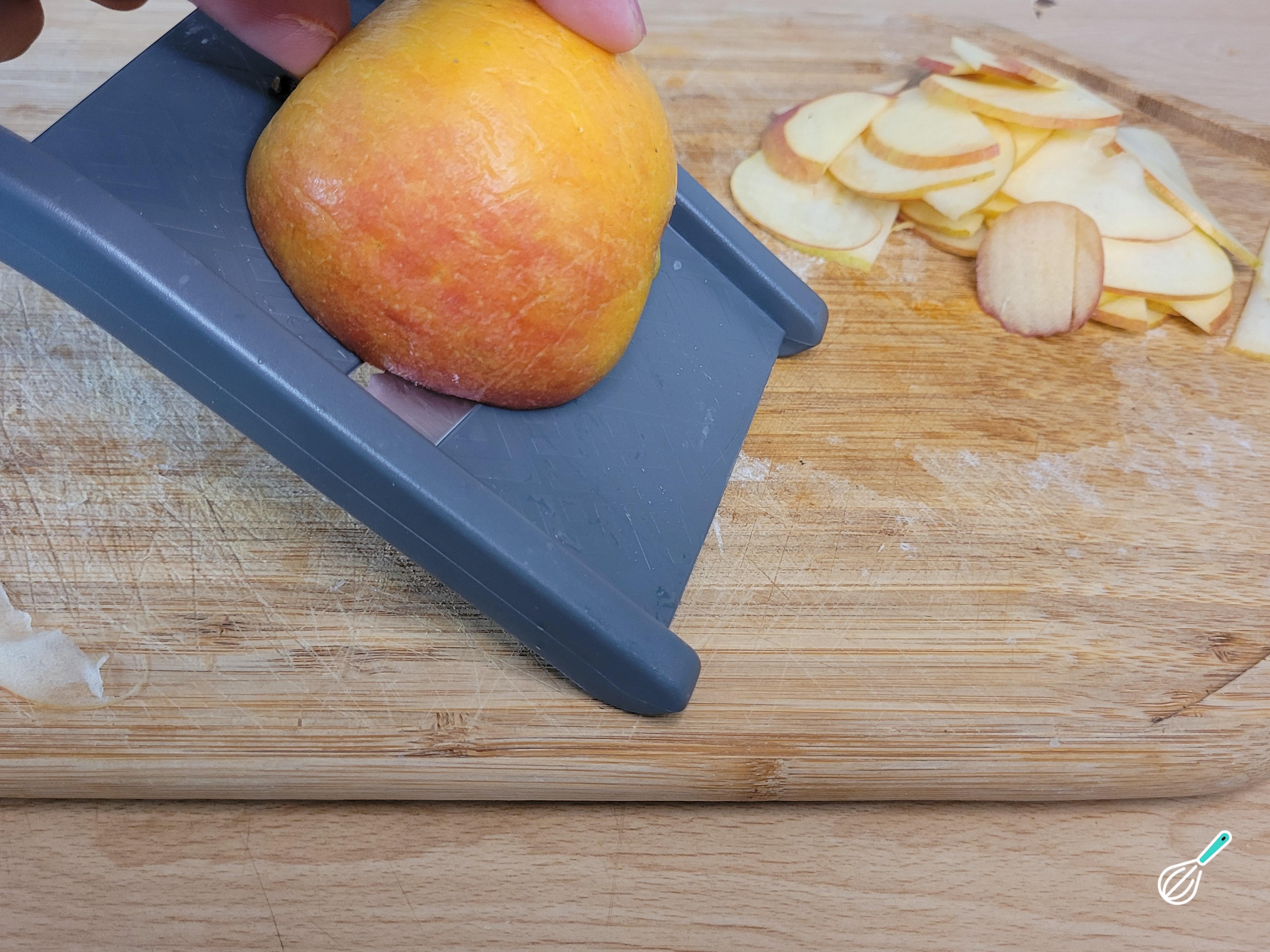 Enquanto isso, antes de misturar os outros ingredientes, corte a outra maçã em fatias fininhas (de preferência com um mandolim). Depois corte cada fatia ao meio para formar como se fossem meias luas. As fatias serão usadas para decorar o bolo por cima.