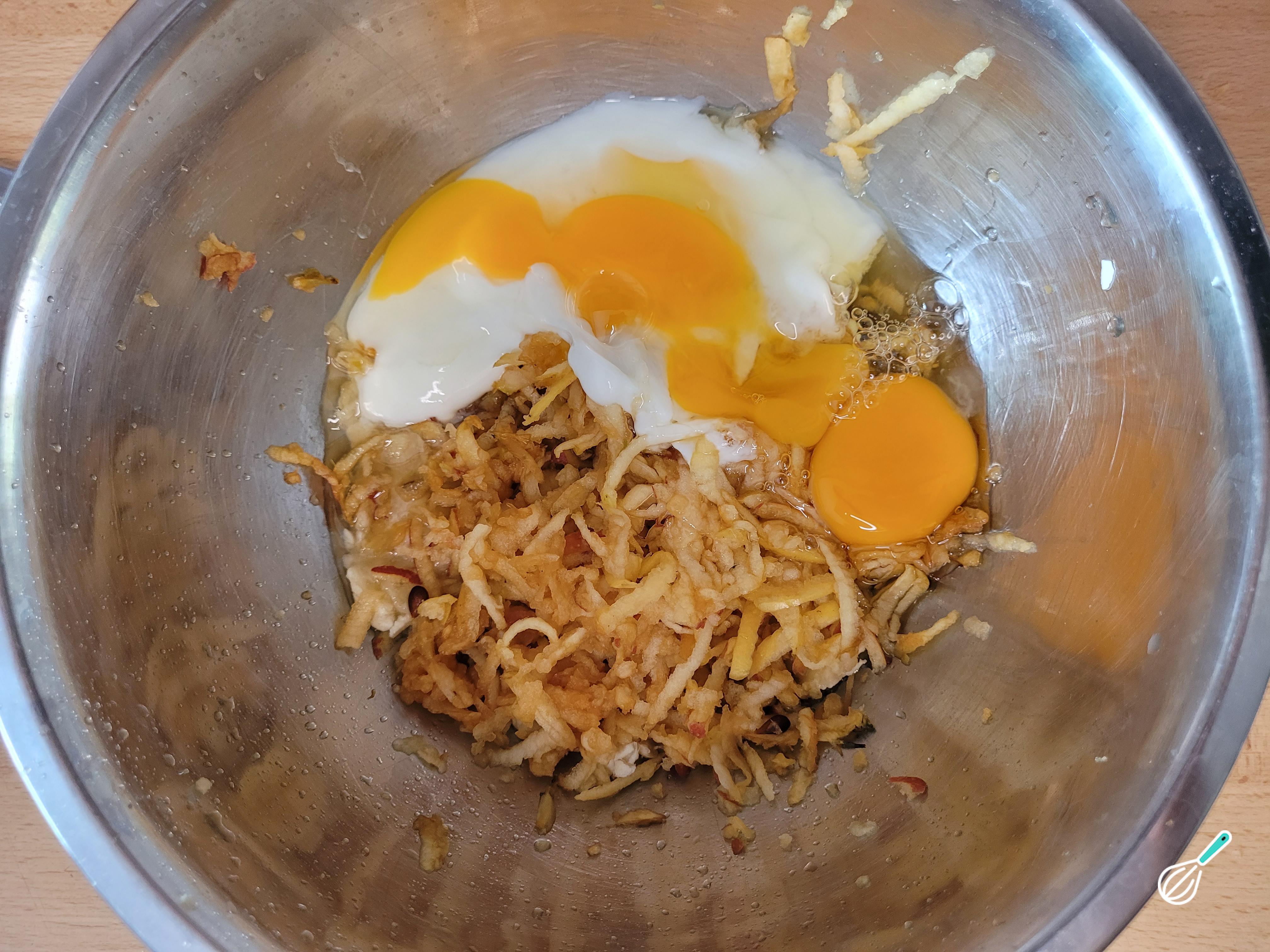 Na tigela com a banana e a maçã raladas, misture todos os ingredientes líquidos.