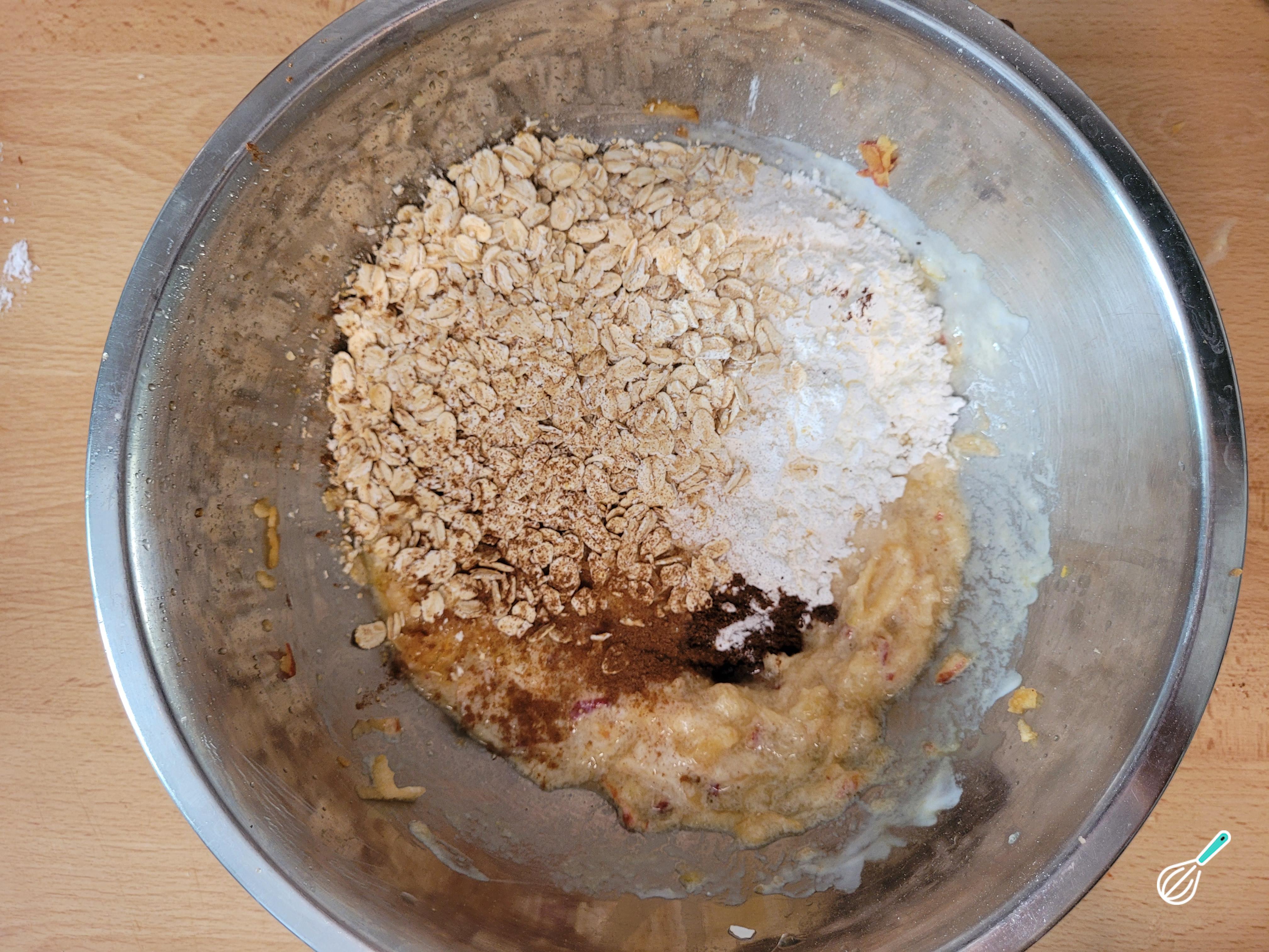 Incorpore todos os ingredientes sólidos e mexa bem para formar uma massa homogênea (ainda vai ter pedacinhos por causa da aveia em flocos, mas os ingredientes devem ficar bem distribuídos por toda a massa).