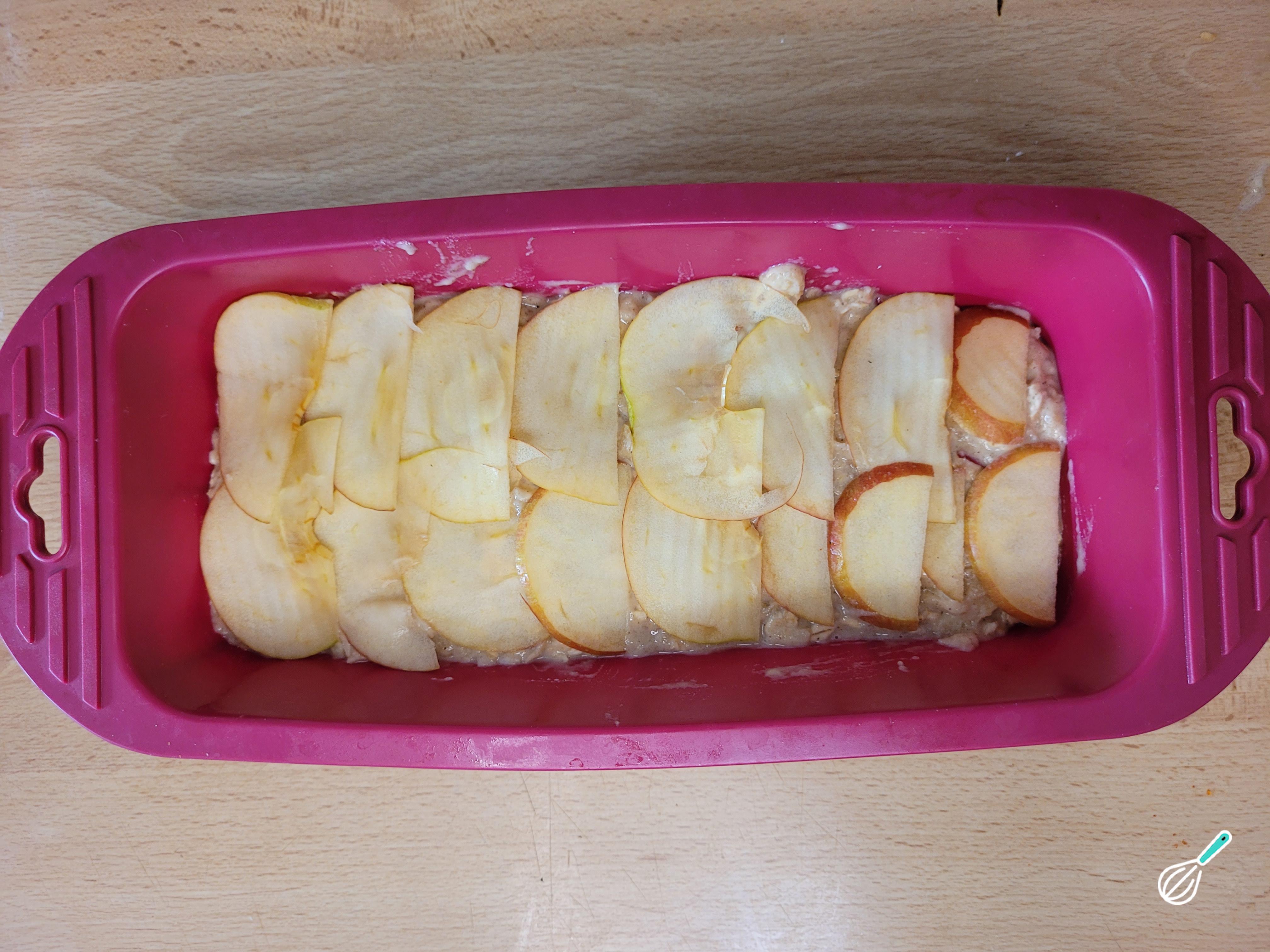 Coloque a massa em uma assadeira (usei uma forma de pão de silicone) e decore com as fatias de maçã. Leve ao forno a 180°C por cerca de 30 minutos ou faça o teste do palito para verificar se está pronto.
