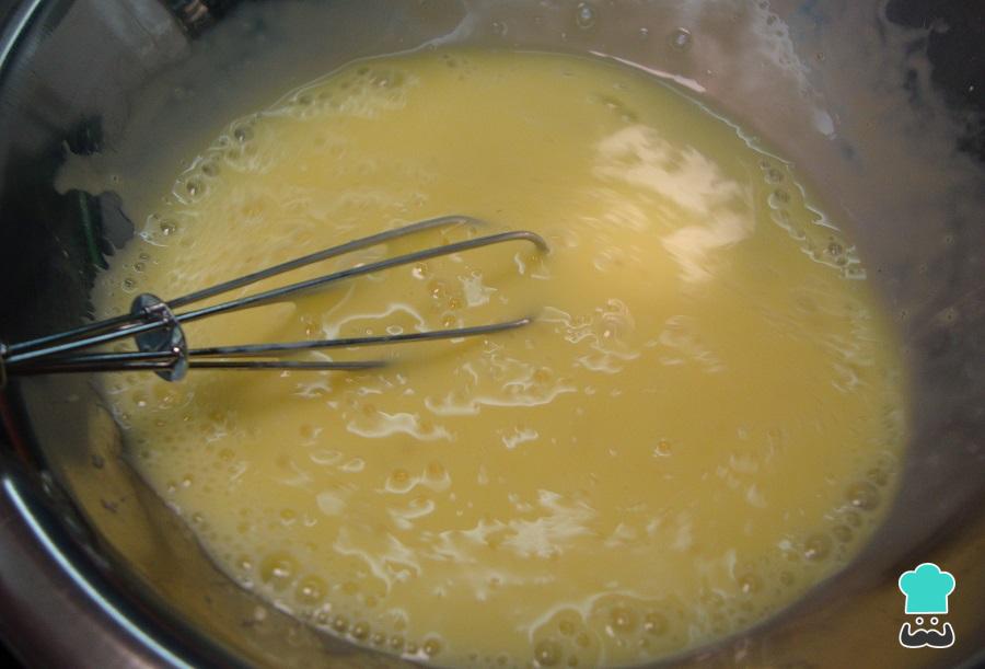 De seguida acrescente o leite e os ovos, voltando a mexer.