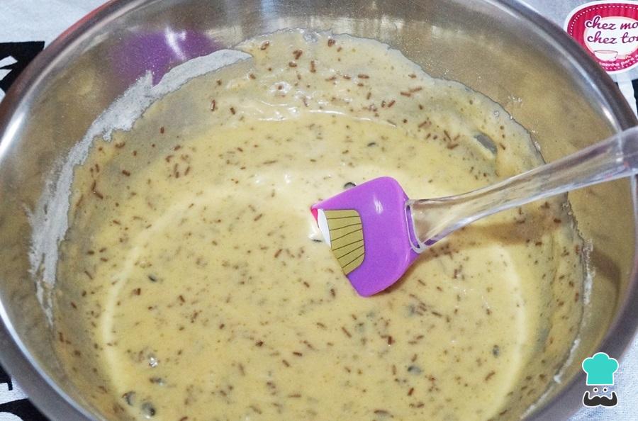 Junte a farinha peneirada, mexa delicadamente para envolver bem, e finalmente adicione o granulado e o fermento, voltando a mexer.