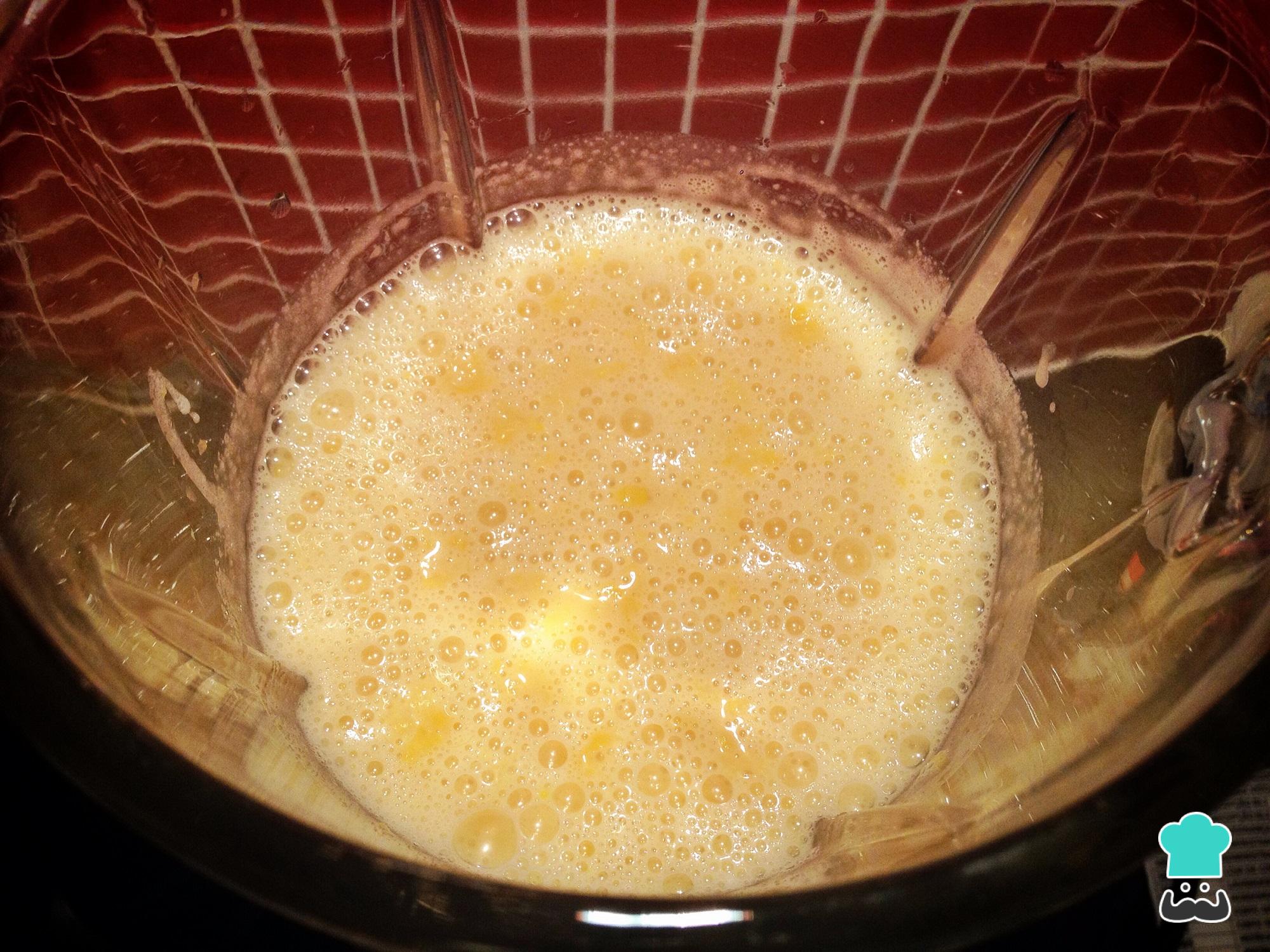 Para fazer este bolo de banana saudável, comece por bater no liquidificador o óleo, os ovos e as bananas em rodelas, até obter um creme homogêneo.