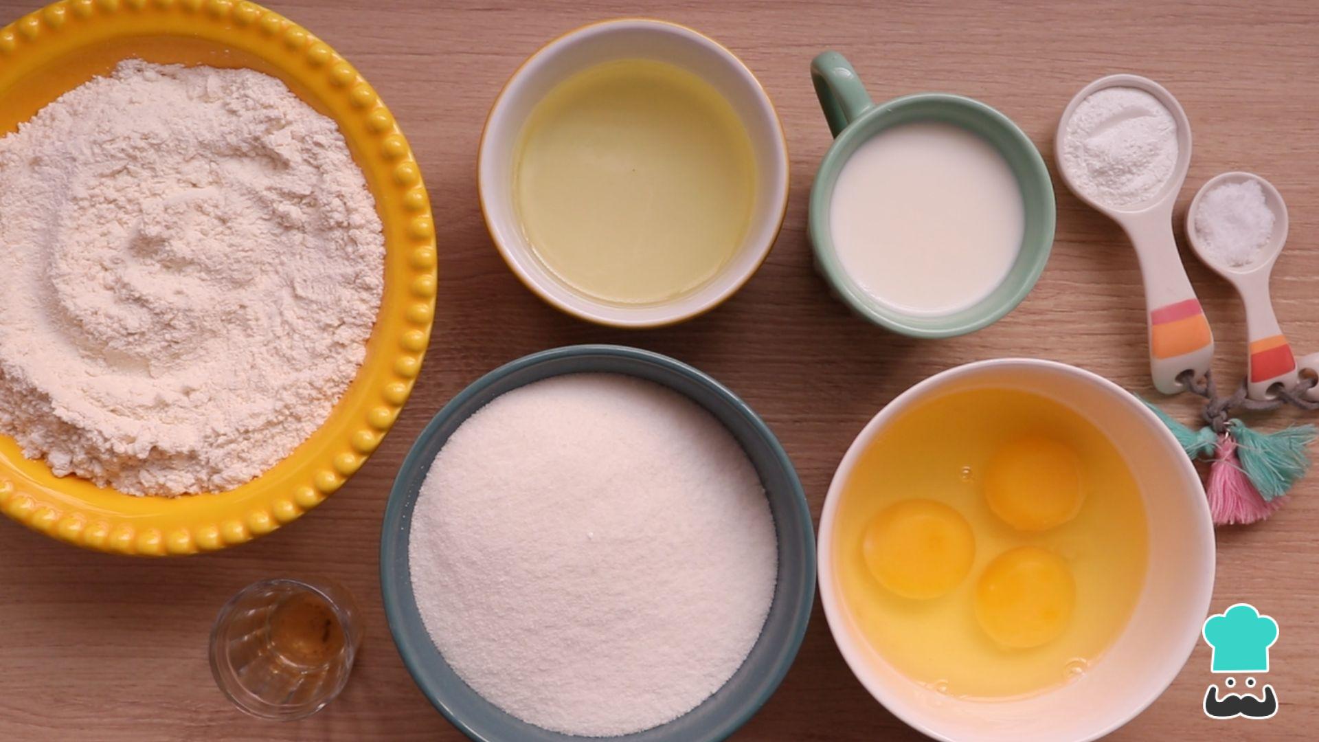 Comece separando os ingredientes para o seu bolo gelado de abacaxi simples. Você pode usar uma geleia industrializada ou uma geleia caseira para a cobertura desse bolo.