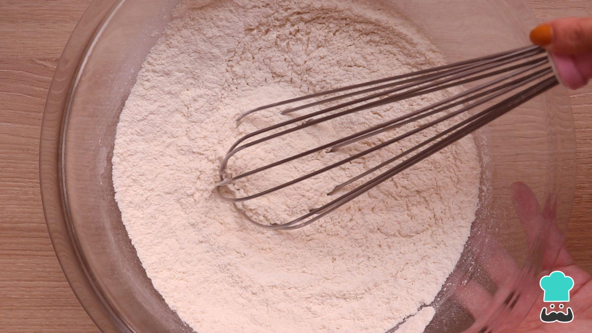Em uma tigela grande peneire a farinha, o fermento e o sal.