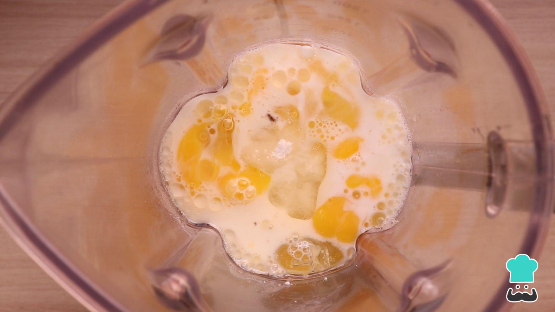Bata no liquidificador os ovos, o açúcar, o óleo e o leite.