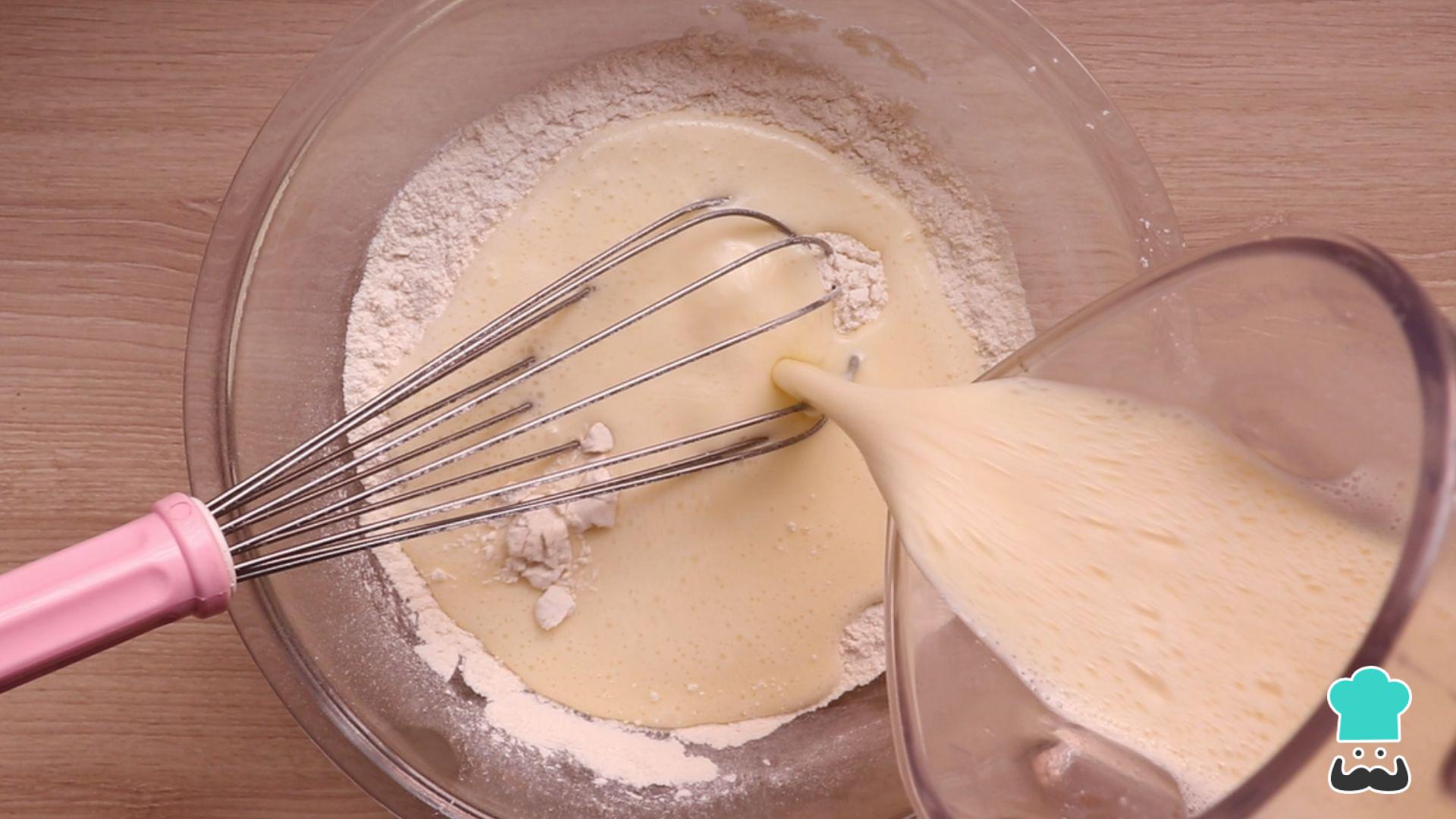 Despeje a massa do liquidificador na tigela com os ingredientes secos peneirados e misture delicadamente até ficar homogêneo.
