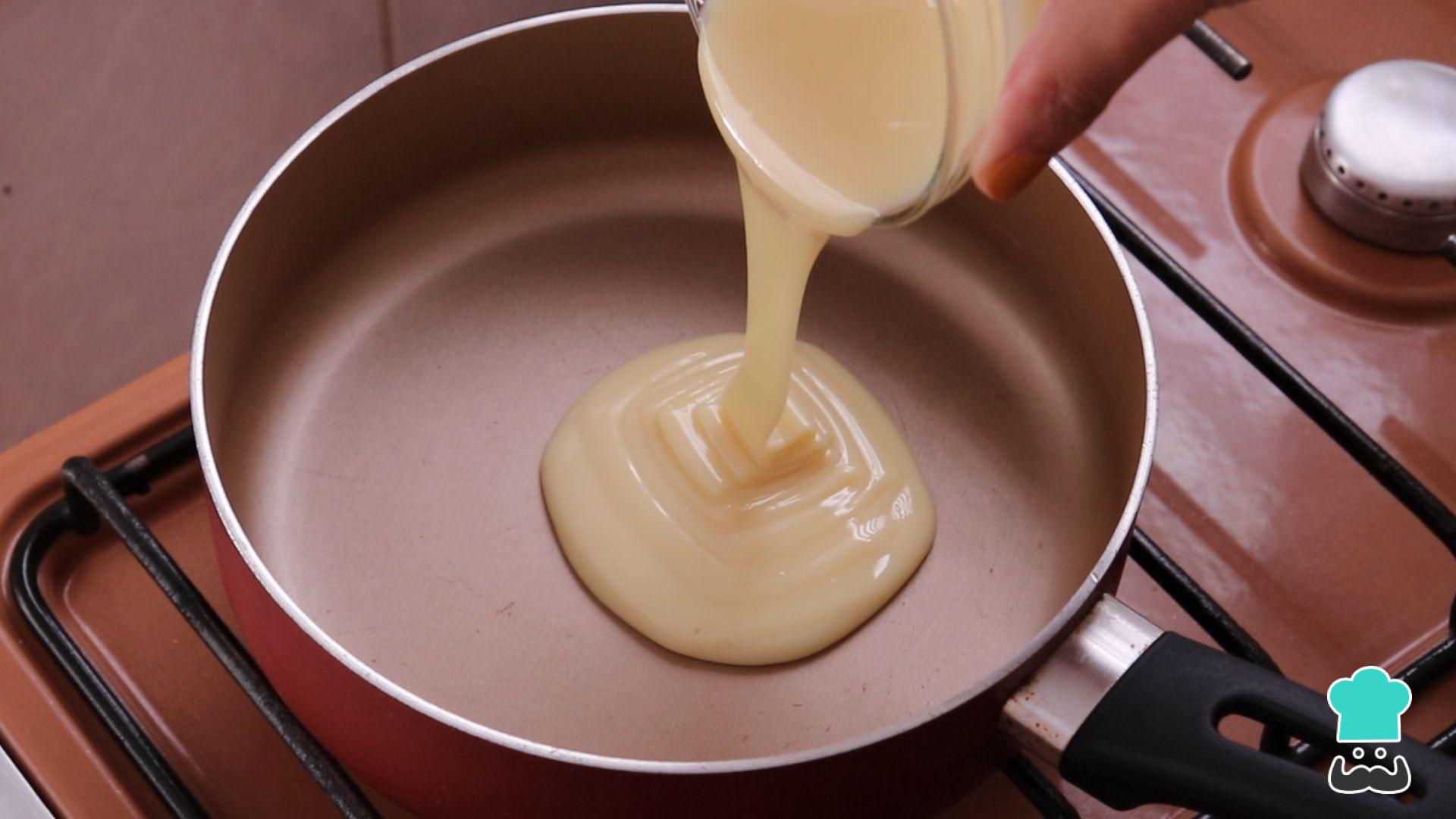 Enquanto assa prepare o brigadeiro branco: coloque o leite condensado e a manteiga em uma panela, leve ao fogo baixo e mexa até engrossar.