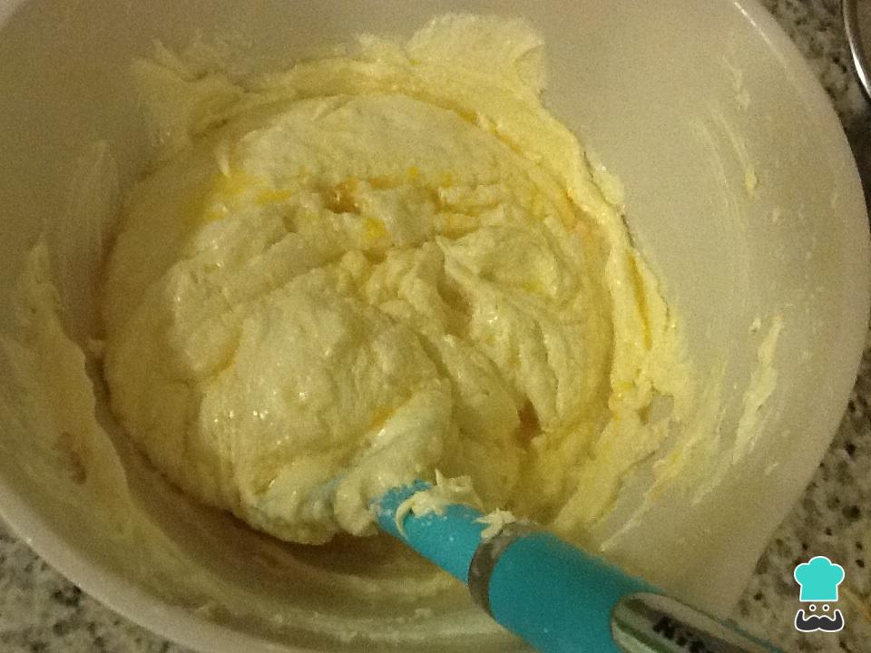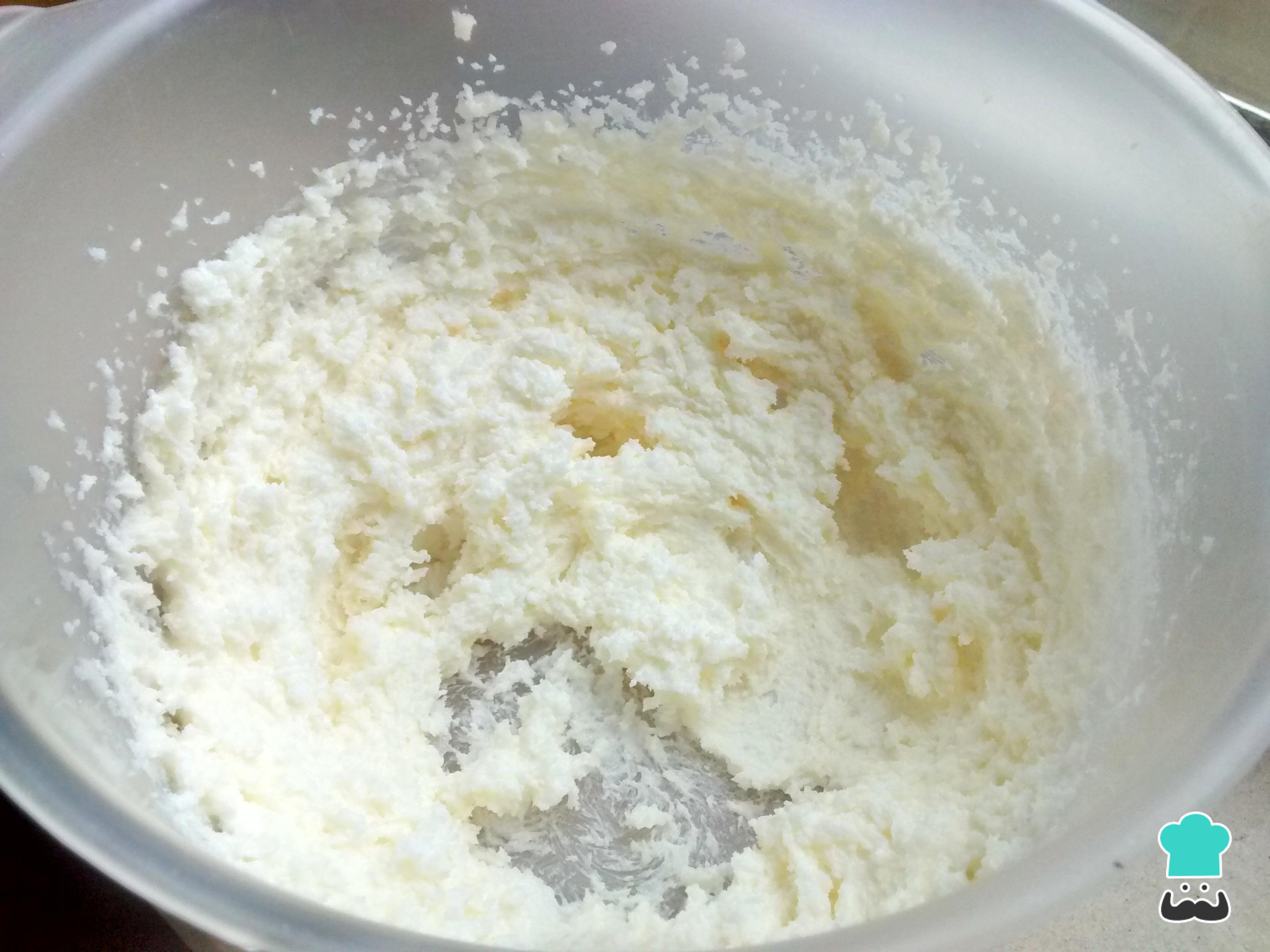 Para preparar esse bolo gelado embrulhado de coco, comece por bater a manteiga, o açúcar e a essência de baunilha até obter um creme.