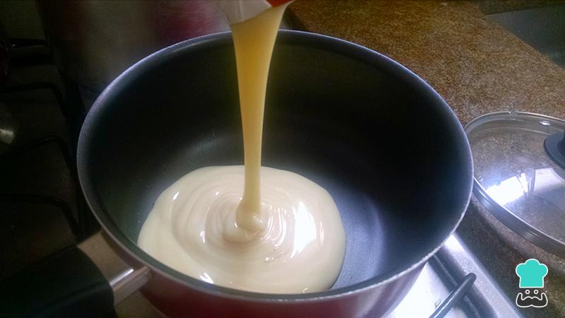 Quando o bolo estiver assado, prepare a calda do bolo gelado: leve ao fogo baixo uma panela com os três leites, somente para esquentar.