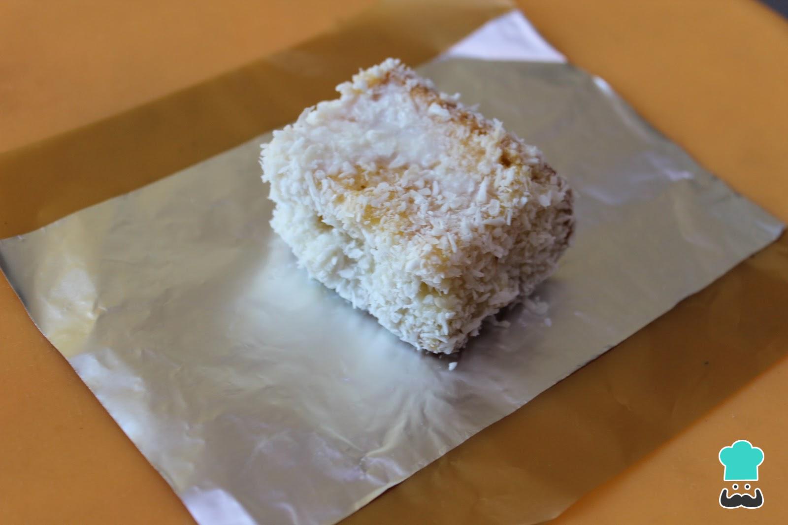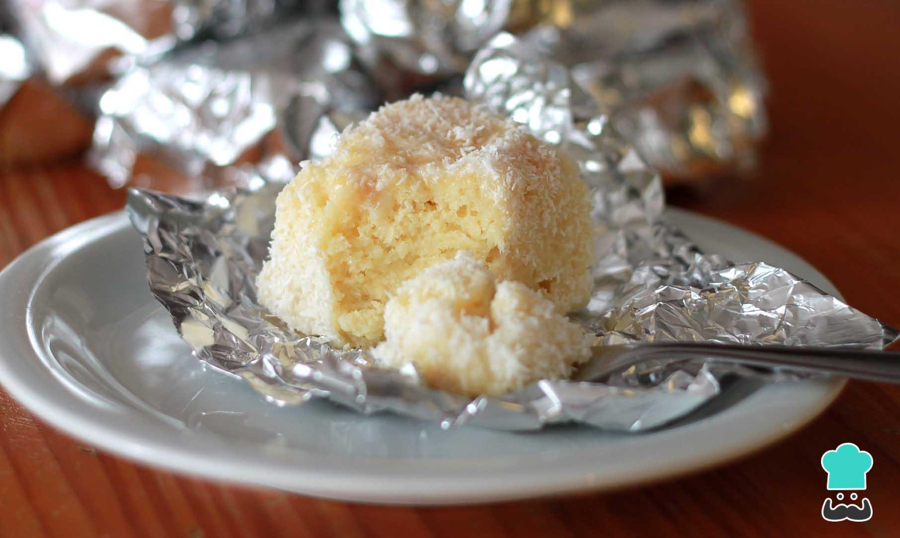 Desenforme o bolo já assado e esfriado, corte em retângulos ou quadrados pequenos, mergulhe na calda anterior e envolva em coco ralado. Embrulhe em pedacinhos de papel alumínio e reserve na geladeira por um mínimo de 2 horas.