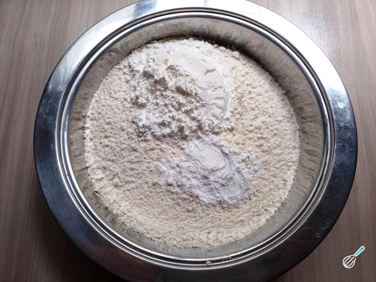 Numa tigela, colocar a farinha de trigo, o amido de milho e o fermento. Misturar e reservar.