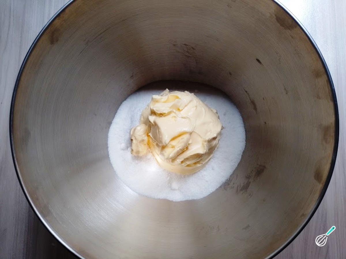 Na tigela da batedeira, colocar o açúcar e a manteiga.