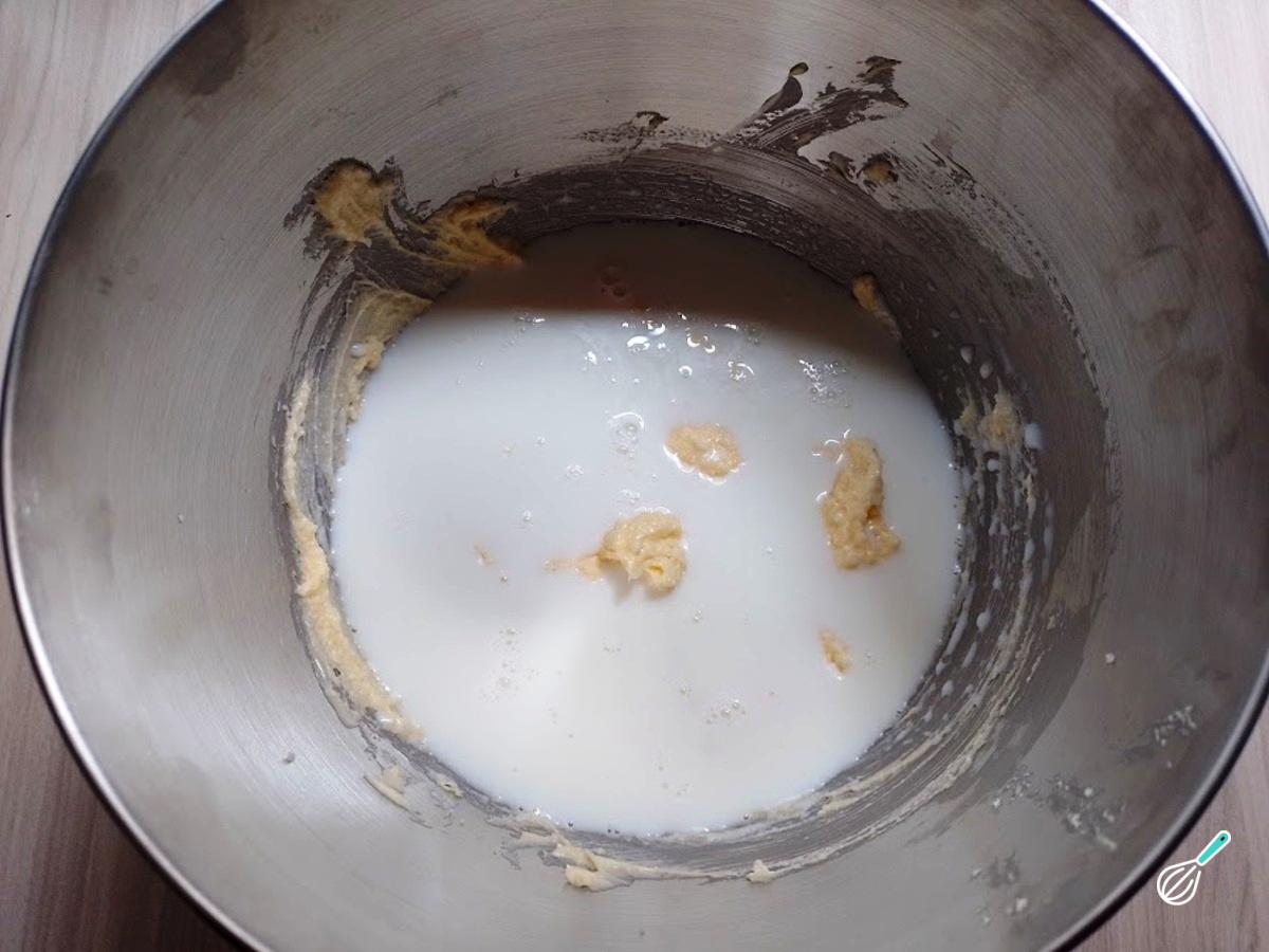 Após, adicionar o leite e bater por mais dois minutos. A partir desta etapa, a mistura ficará com aspecto de talhado, porém é normal.