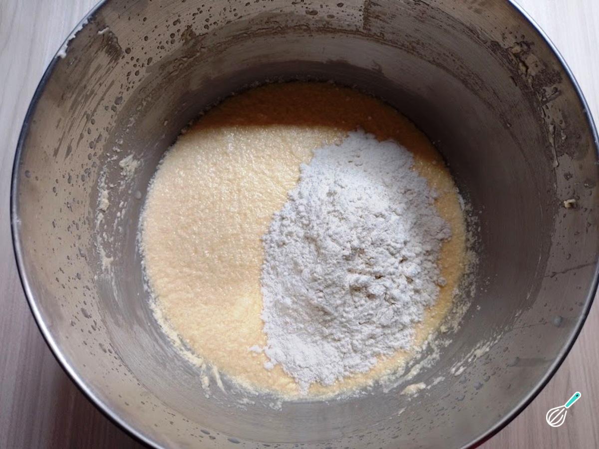 Seguindo o processo, adicionar a mistura reservada da farinha de trigo. Colocar em 3 partes e bater na velocidade mais baixa da batedeira, apenas para formar uma mistura homogênea.