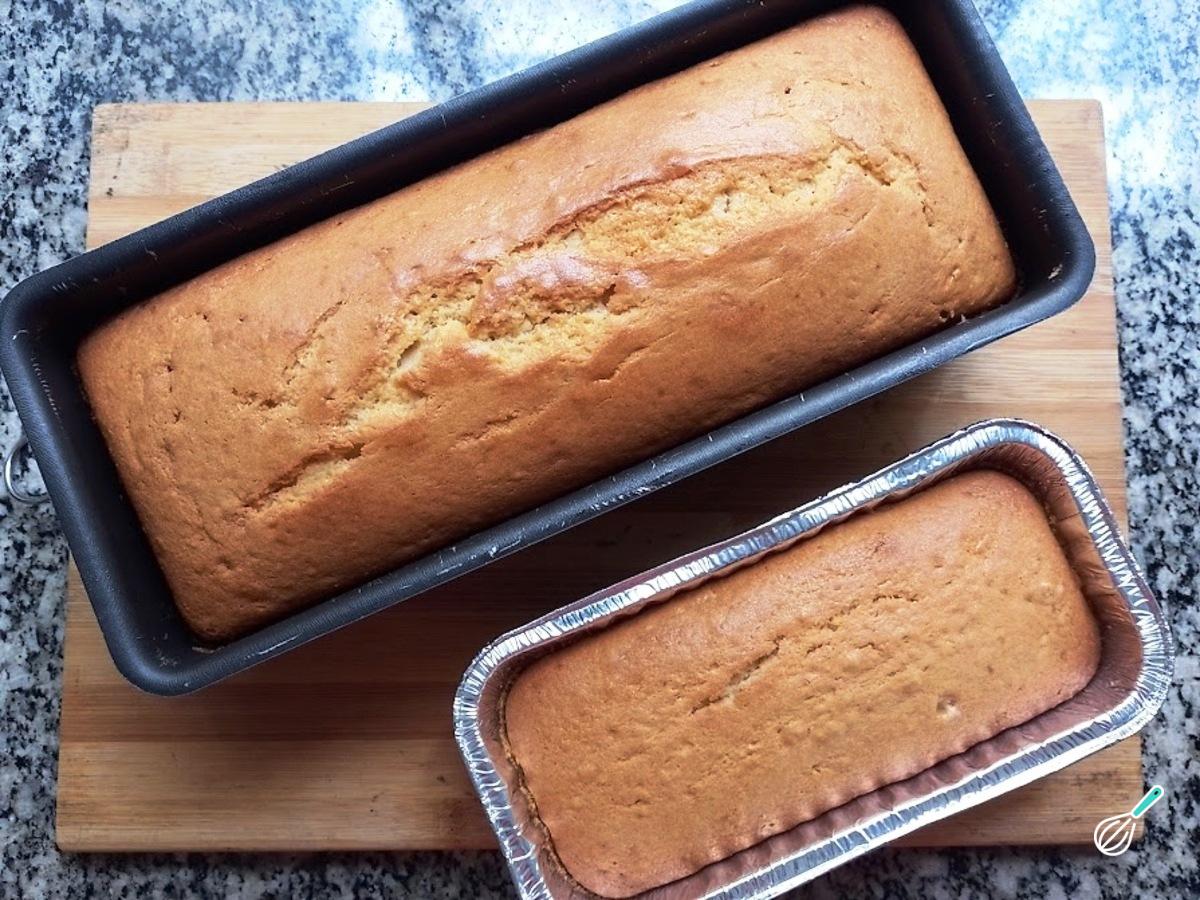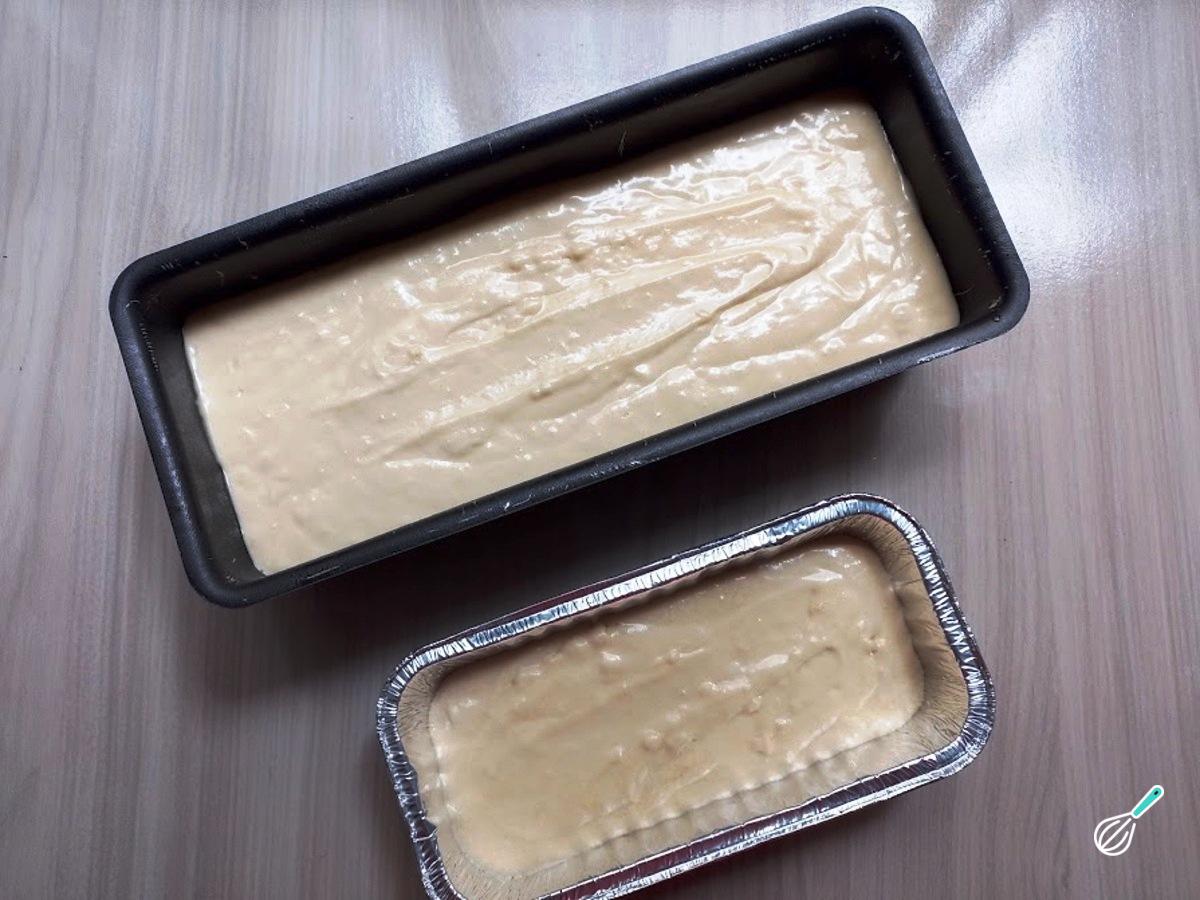 Colocar numa forma retangular. Usei uma de 28 cm de comprimento por 7 cm de altura. E também uma forma para bolo inglês descartável.