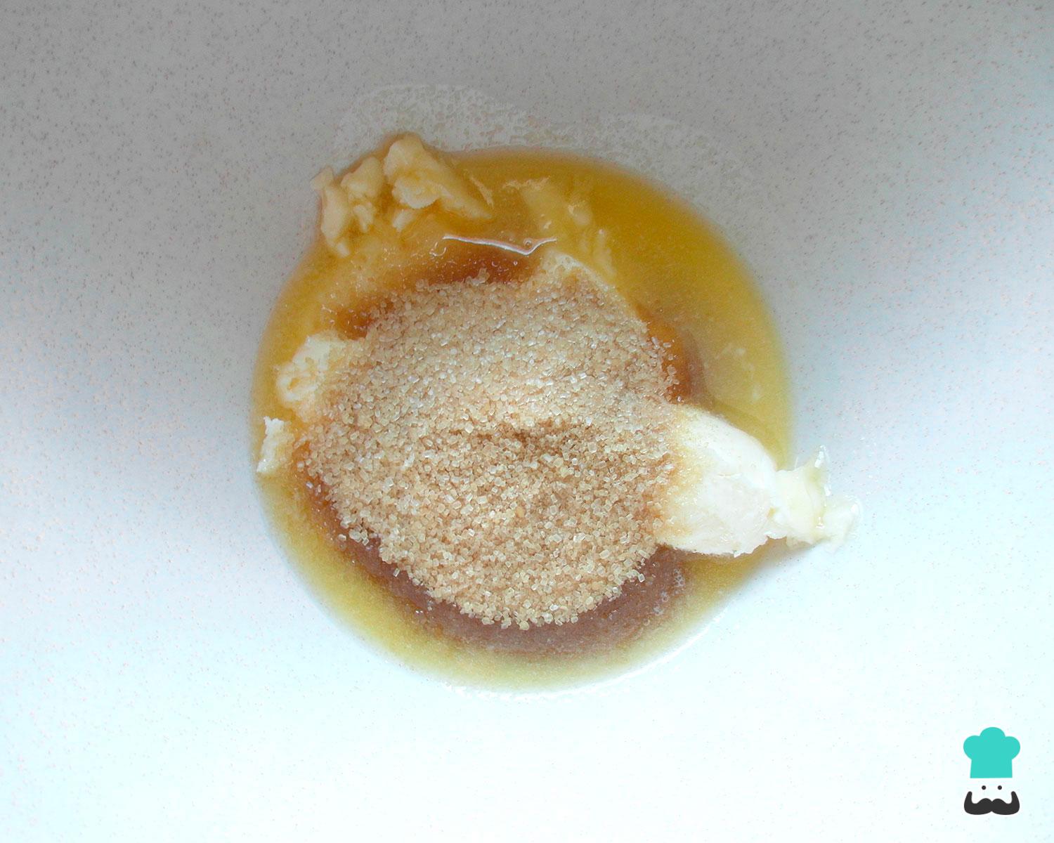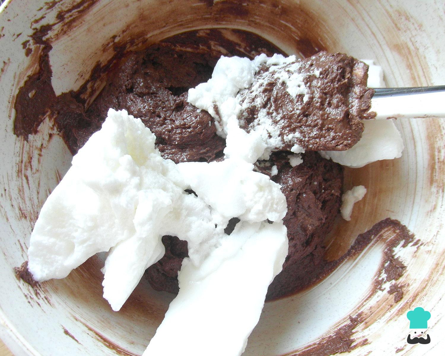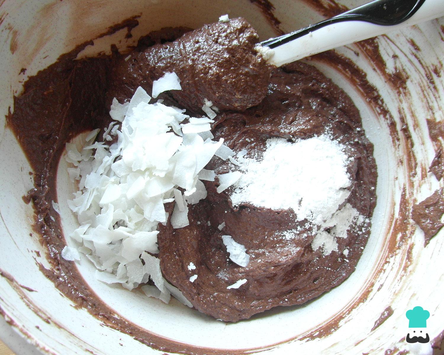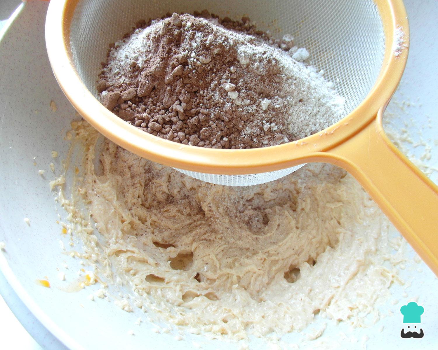 O passo seguinte desta receita de bolo de aveia e cacau é misturar a farinha de trigo, a aveia e o cacau. Adicione à mistura anterior usando uma peneira, para evitar que se formem grumos na massa, e misture com um fouet ou espátula.