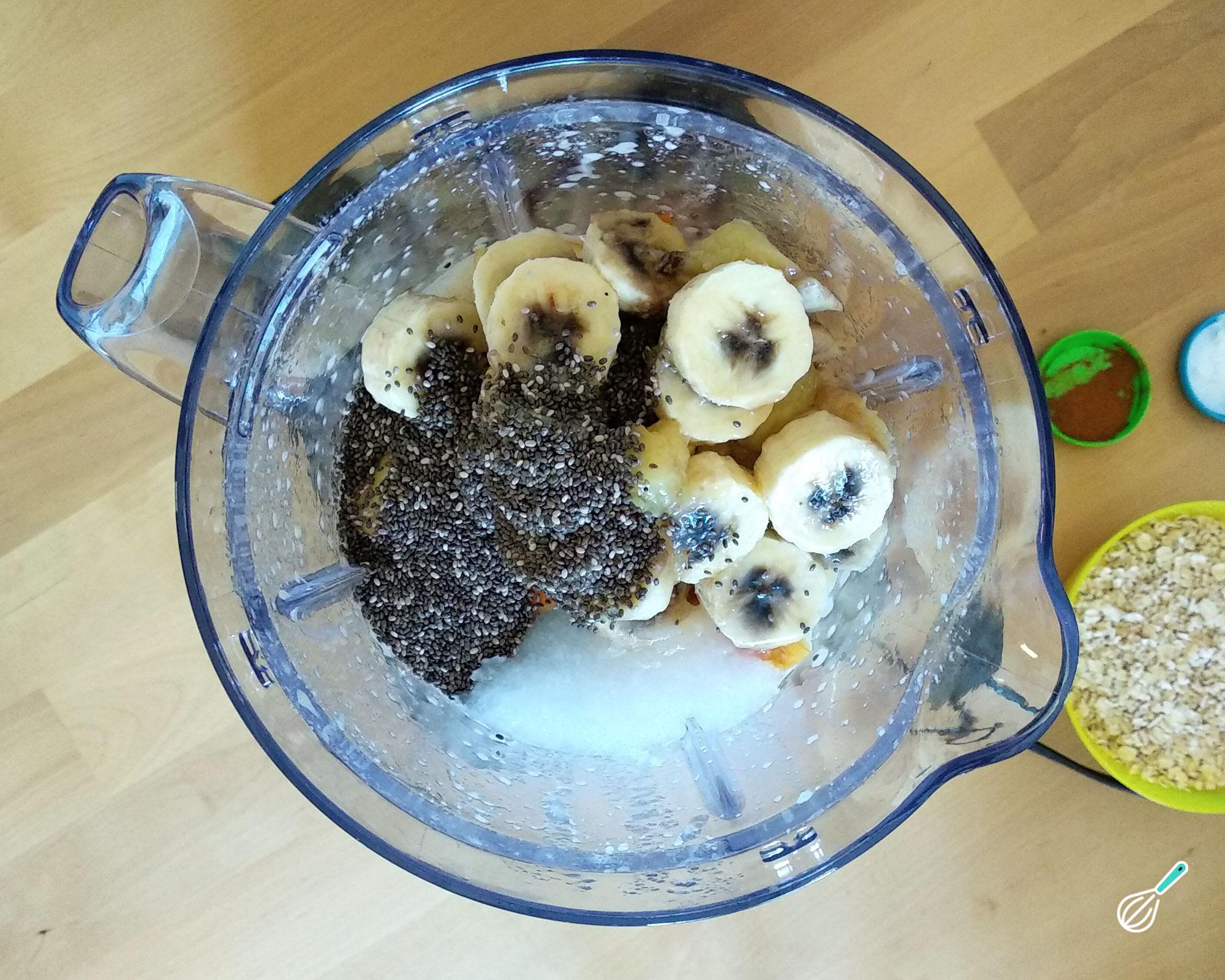 Pré-aqueça o forno nos 180ºC (forno médio). Bata os ovos no liquidificador ou num processador por 2-3 minutos, até espumar bem (isso é importante para conseguir um bolo mais fofinho). Depois coloque as maçãs e as bananas, a chia e o óleo de coco.