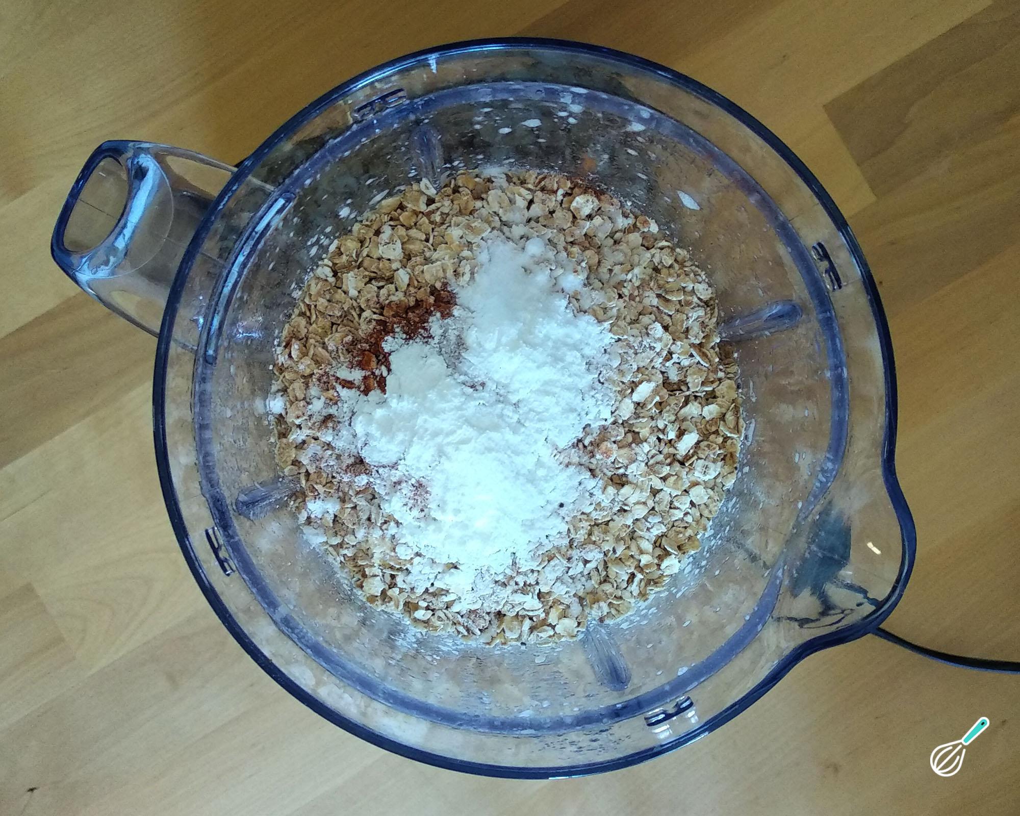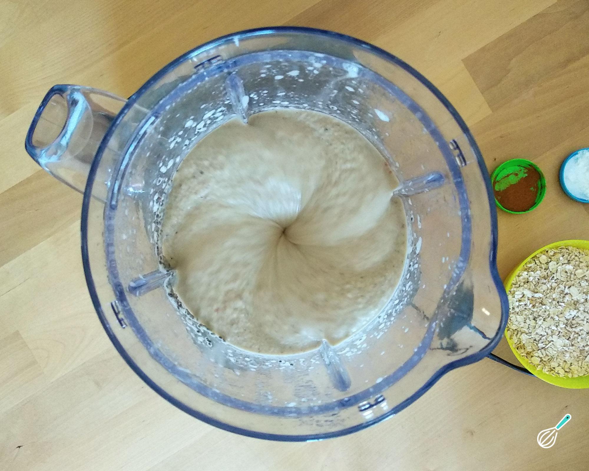 Adicione a aveia, a canela, o fermento e o bicarbonato e misture muito bem com uma colher. Se preferir, poderá transferir a mistura do liquidificador para uma tigela e misturar aí estes ingredientes secos.