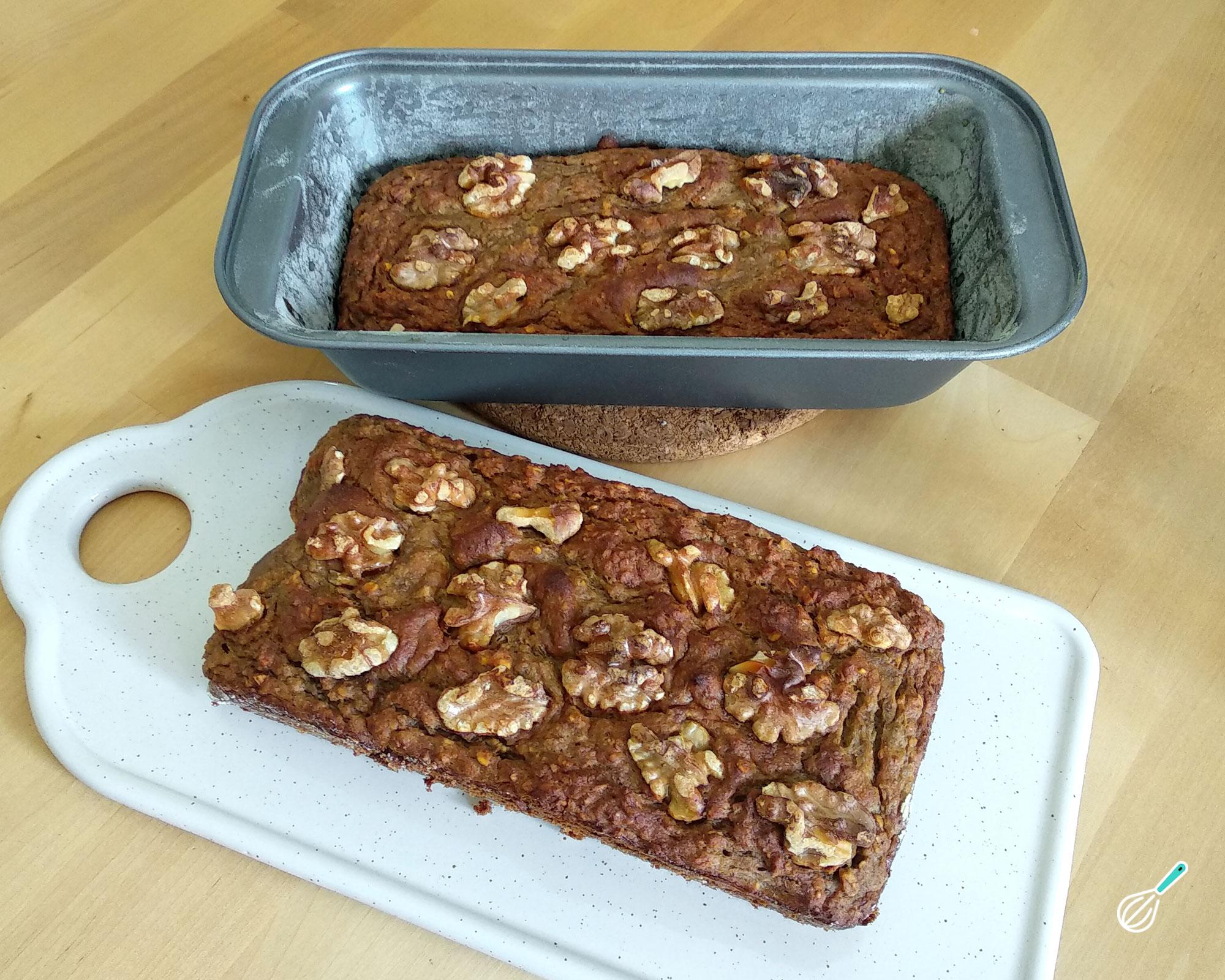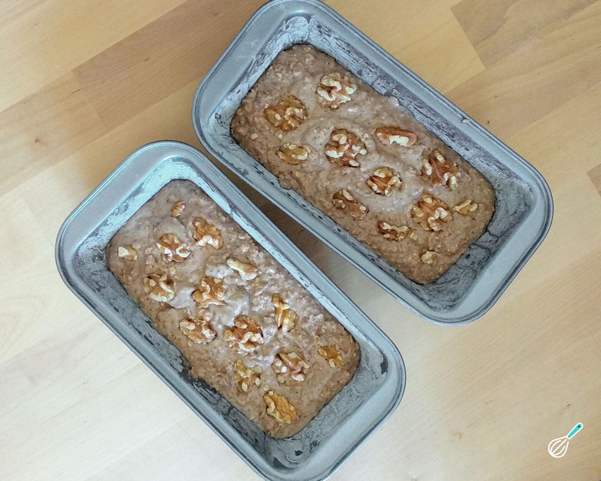 Unte com óleo de coco e polvilhe farinha de aveia ou de arroz em duas formas de pão de 20 x 10 ou numa forma redonda de 20 cm. Coloque a massa deste bolo de banana e maçã e, se quiser, decore com nozes.