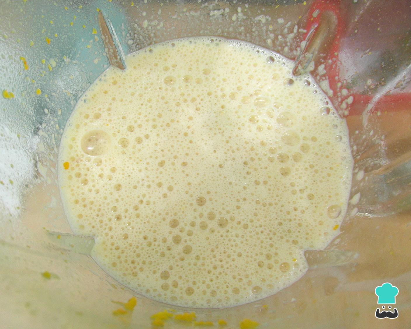 Para preparar este bolo de laranja com farinha integral bata os ingredientes líquidos no liquidificador: o suco de laranja, o óleo e os ovos.