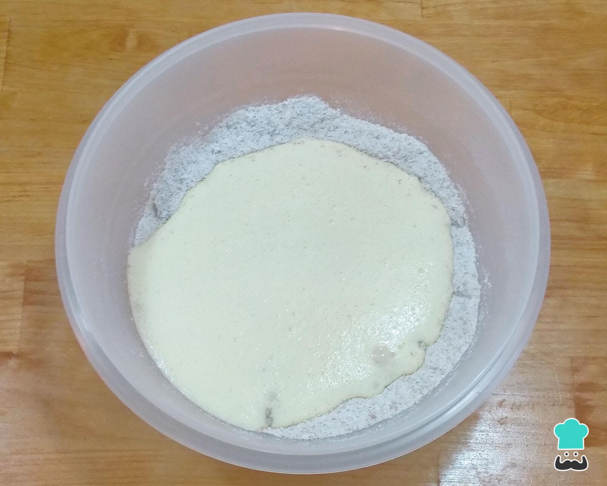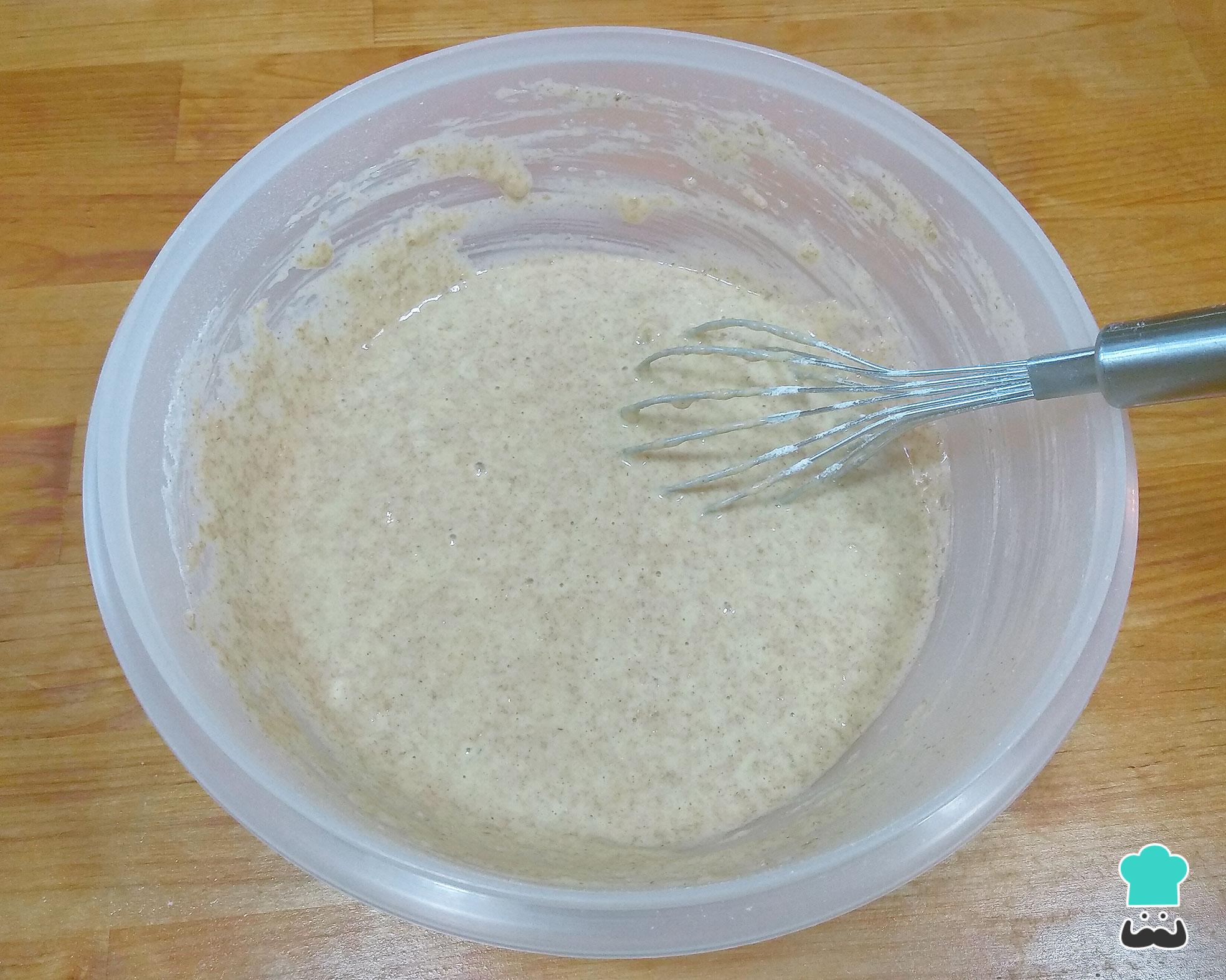 Peneire o trigo integral e o açúcar para uma tigela e adicione a mistura do liquidificador. Misture até incorporar muito bem.