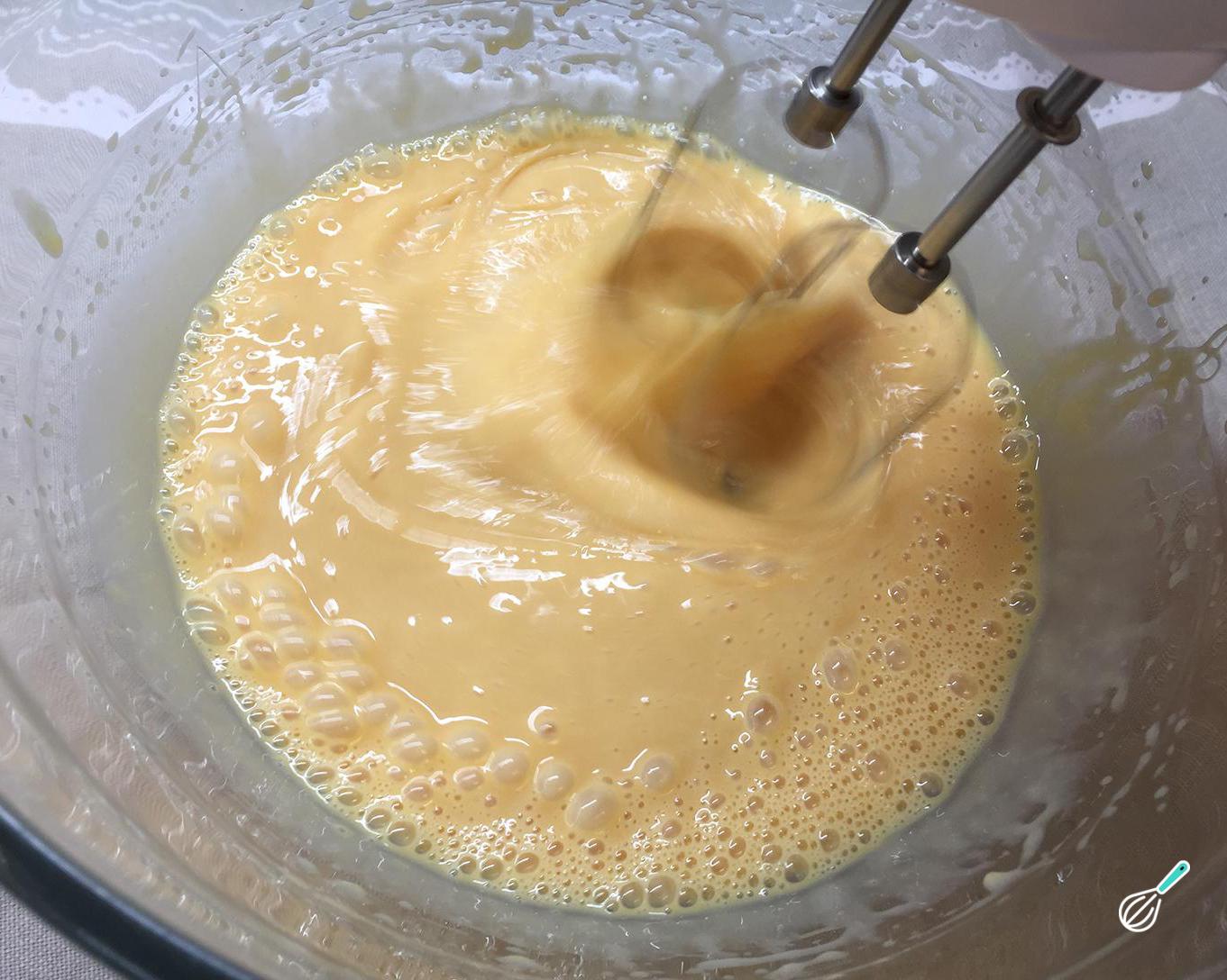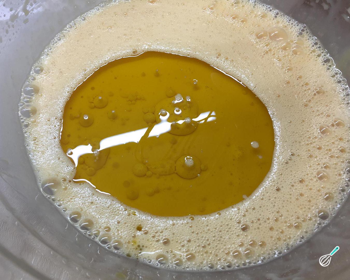 Seguidamente adicione os restantes ingredientes líquidos: o azeite de oliva e a essência de baunilha. Volte a bater até misturar.