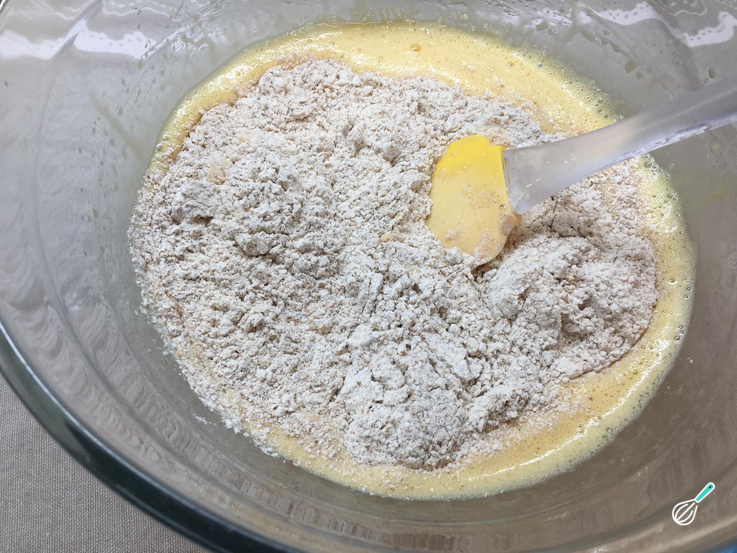 Adicione agora a farinha de trigo integral e incorpore com a ajuda de um fouet ou espátula até desfazer todos os grumos. Por fim adicione o fermento para bolo e misture.
