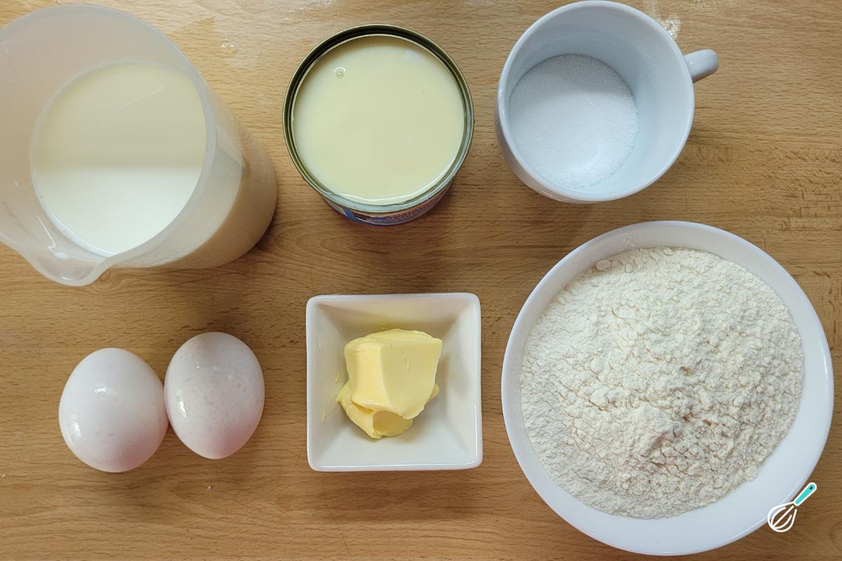 Separe os ingredientes para fazer seu bolo liso com leite condensado. Esse bolo é bem simples e leva poucos ingredientes, mas você pode incrementar aromatizando com baunilha ou raspas de limão ou laranja.