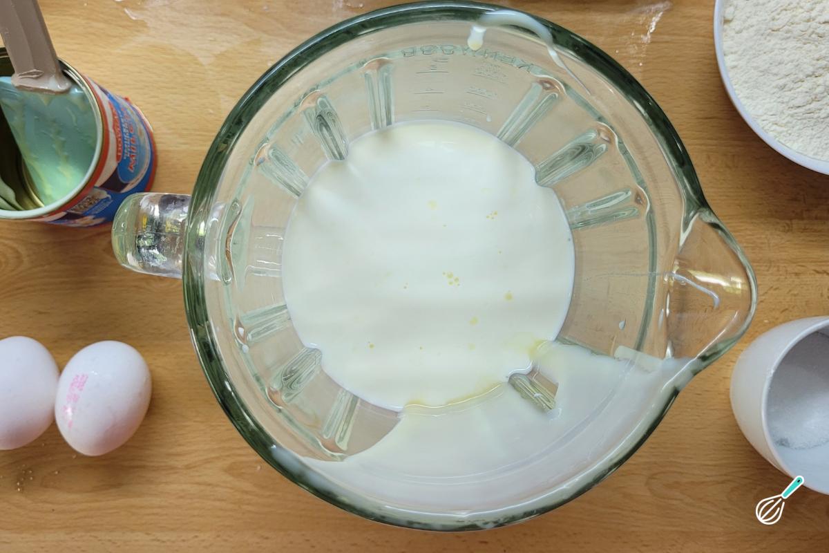 No liquidificador, coloque o leite e o leite condensado e bata bem.