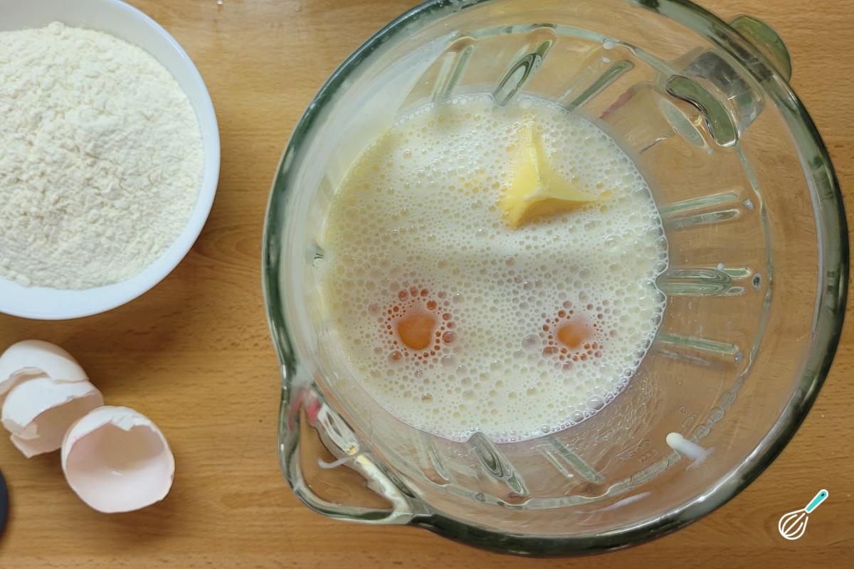 Depois, adicione o açúcar, os ovos e a manteiga e bata novamente até ter uma mistura homogênea. Com o liquidificador ainda batendo, adicione a farinha aos poucos, sempre batendo. É isso que vai fazer com que o bolo fique com uma textura bem cremosa por dentro.
