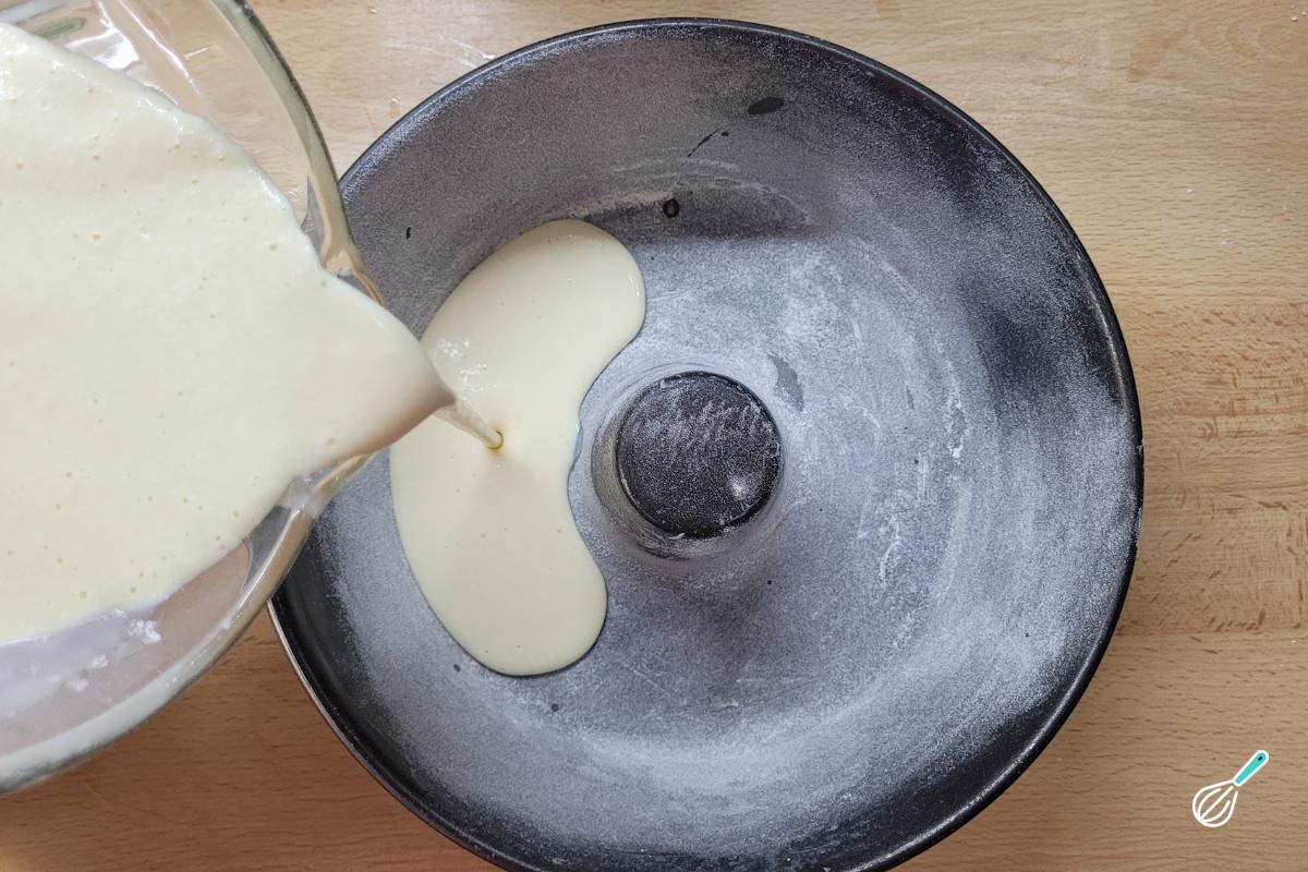 A massa desse bolo fica mais líquida do que um bolo comum - é assim mesmo. Transfira a massa para uma forma untada e enfarinhada. Usei uma forma de furo no meio untada com manteiga e polvilhada com farinha de trigo.