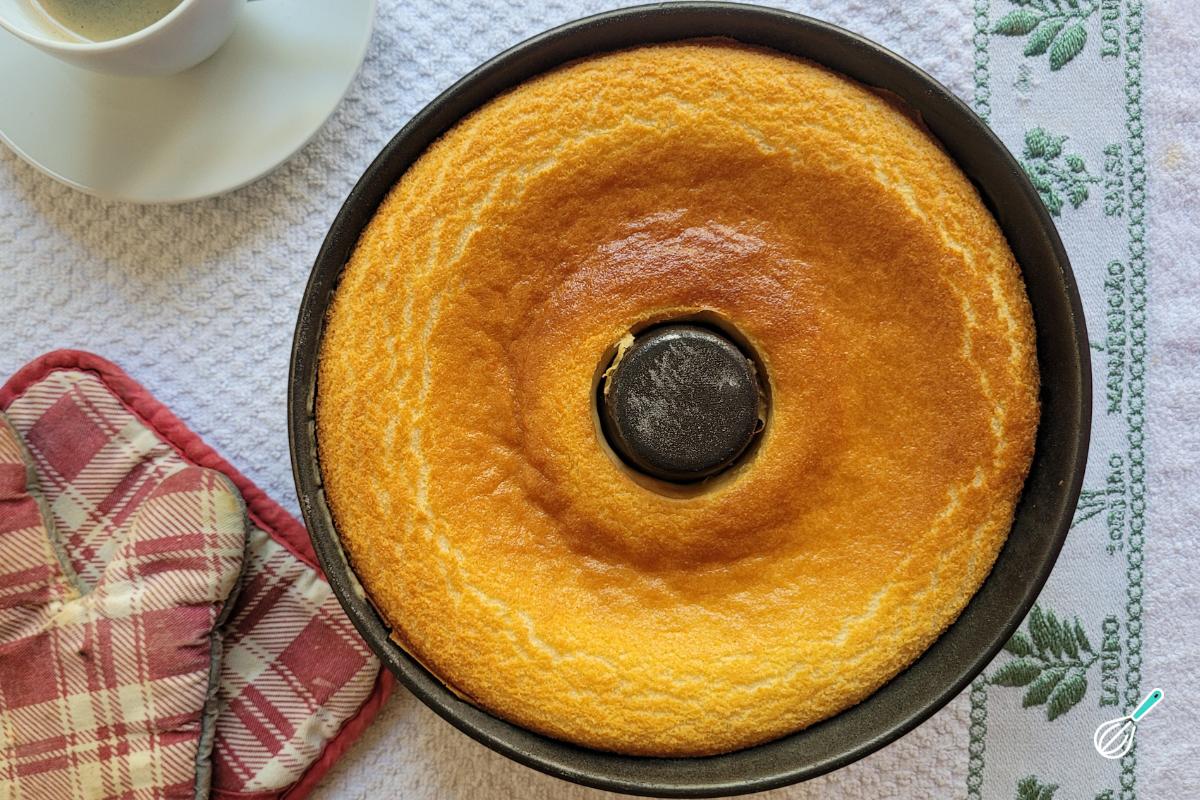 Leve ao forno pré-aquecido 180oC por 30-40 minutos ou até que o bolo esteja assado - ele fica com uma corzinha dourada por cima. Como não leva fermento, esse bolo não cresce tanto.