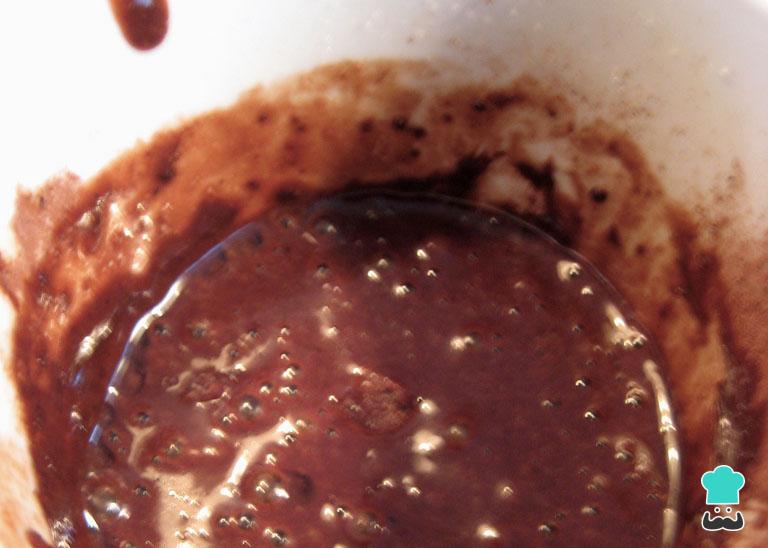 Derreta o óleo de coco na xícara e adicione os demais ingredientes: a farinha, o xylitol, o cacau ou baunilha, o ovo e o fermento. Misture tudo muito bem com um garfo, até que já não restem grumos.