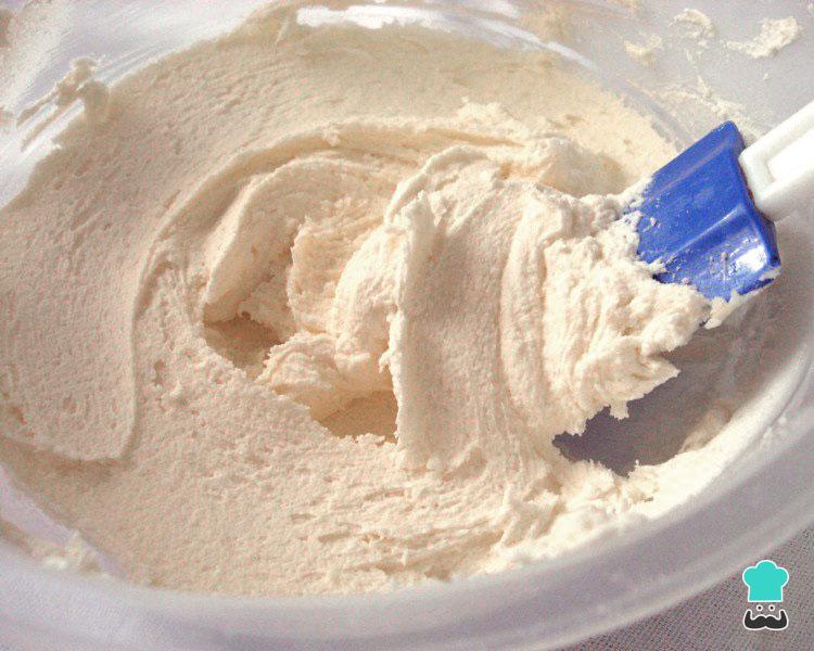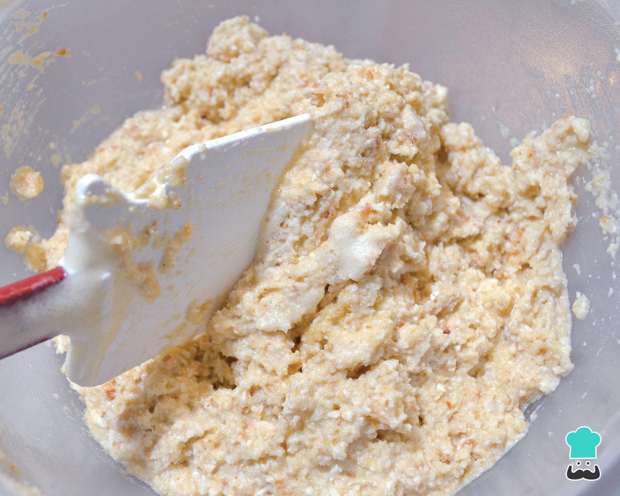 O resultado será uma massa cremosa e com pouca liga entre os ingredientes (com aspeto talhado), mas não se preocupe porque dará certo! Coloque numa forma de aproximadamente 20 x 30 cm untada com manteiga.