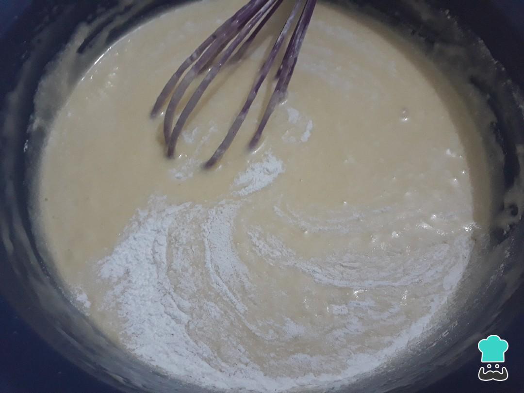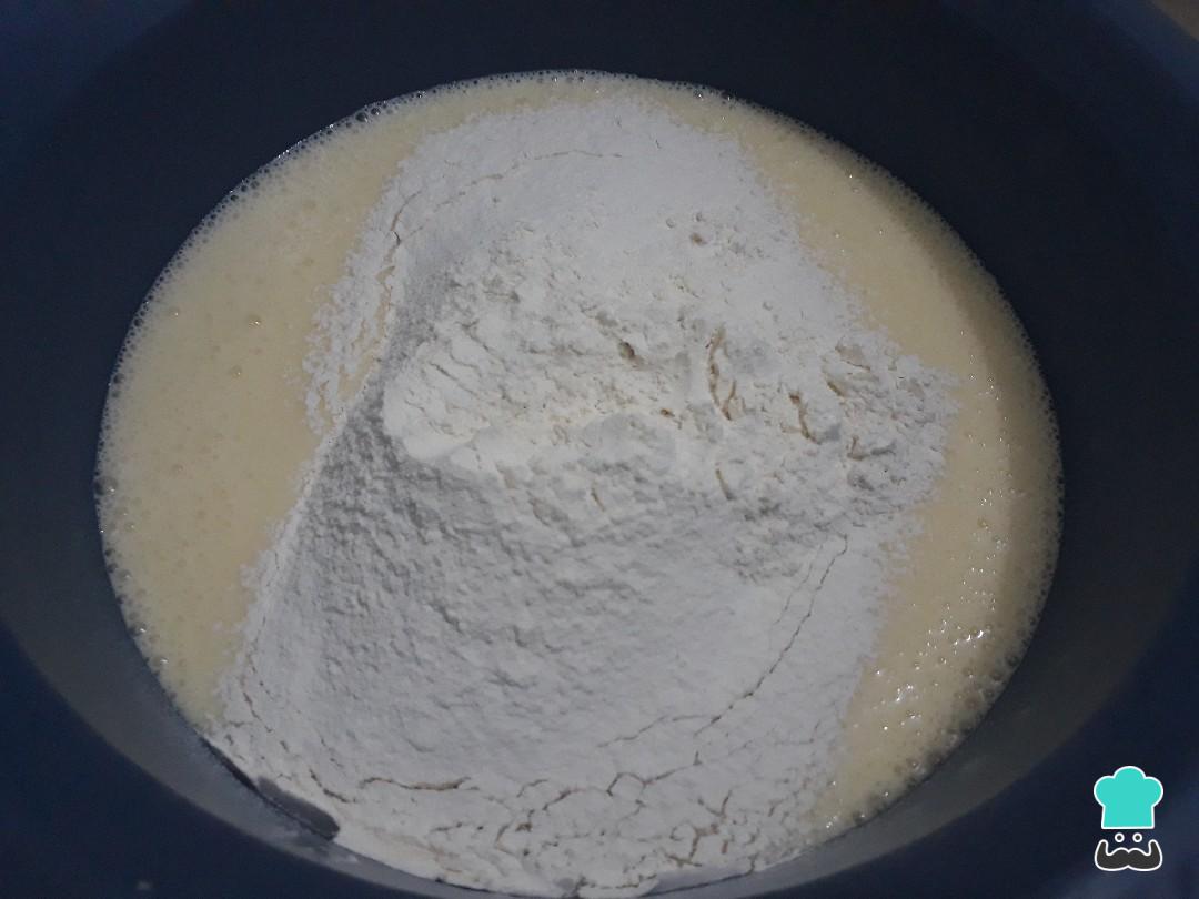 Despeje a mistura do liquidificador em um recipiente e adicione a farinha de trigo peneirada. Misture bem e delicadamente até incorporar.