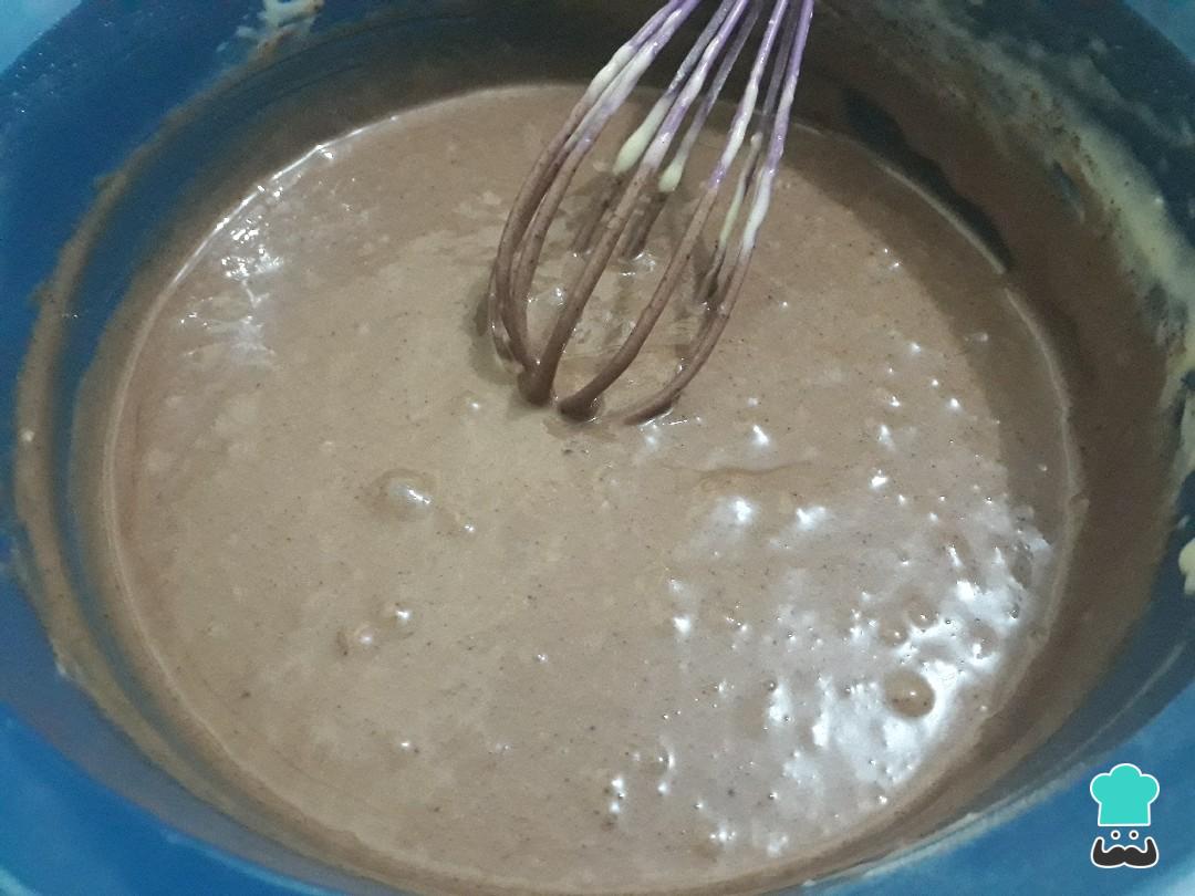 No restante da massa coloque 4 colheres de chocolate em pó e, se você quiser, uma pitada de canela também. Misture bem.