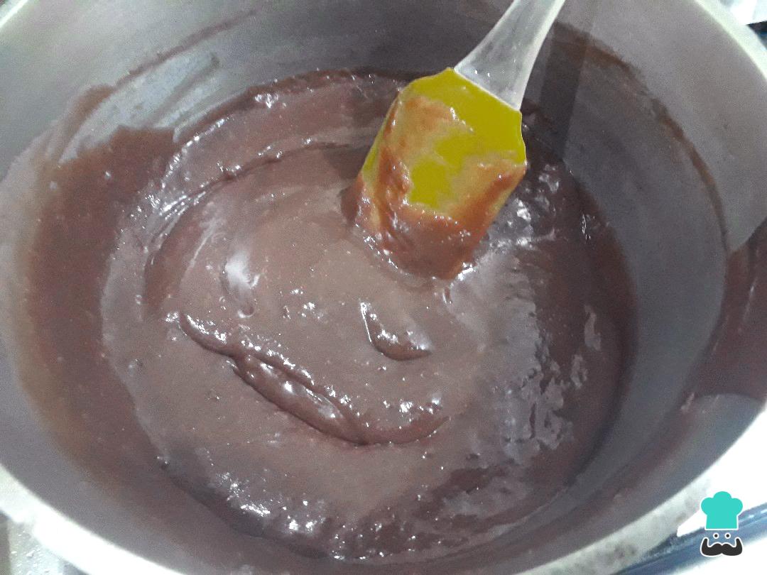 Para a cobertura de brigadeiro em uma panela coloque o leite condensado, a manteiga e 4 colheres de chocolate. Leve ao fogo baixo e misture sem parar até engrossar.