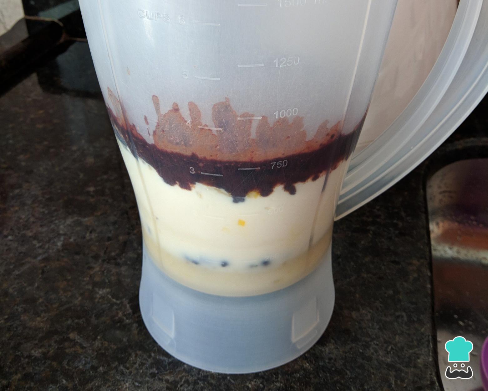 No liquidificador bata os seguintes ingredientes do bolo de chocolate: os ovos, o leite, o açúcar, o chocolate em pó, o sal, o óleo e a essência de baunilha.