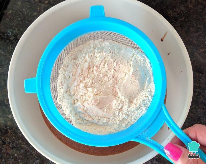 Dica: Peneirar a farinha de trigo ajuda a reduzir os grumos de farinha e a deixar a massa de bolo mais leve e fofinha.