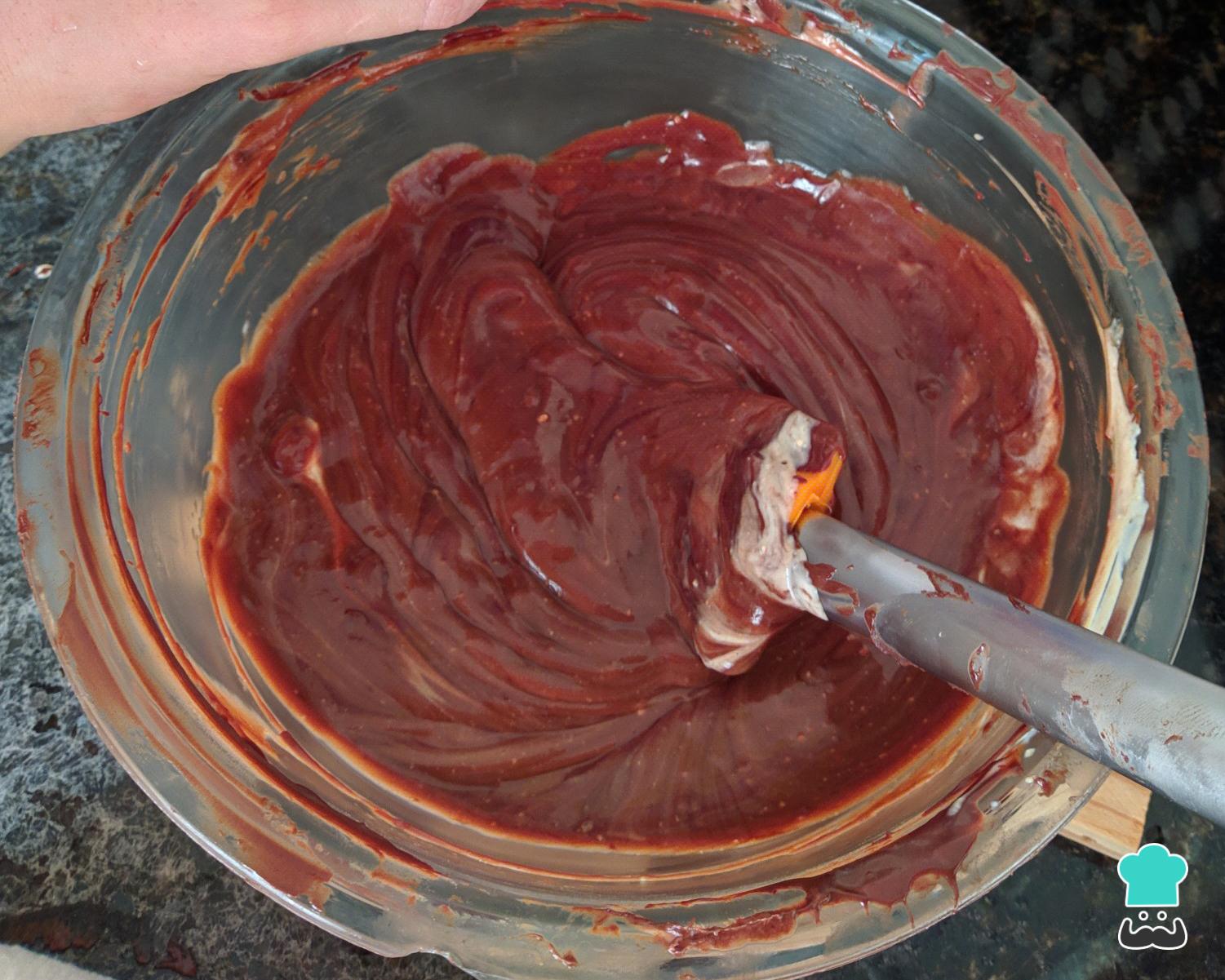 Seguidamente prepare a mousse de chocolate para bolo: derreta os dois chocolates no microondas ou em banho maria. Depois de totalmente derretido, adicione o creme de leite e misture até ficar homogêneo.