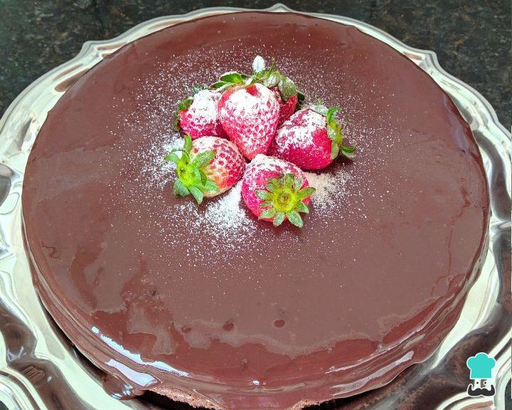 Na hora de servir desenforme o bolo com cuidado e despeje brigadeiro cremoso sobre ele - veja como fazer brigadeiro cremoso. Decore com morangos a gosto e, se quiser, polvilhe açúcar de confeiteiro.