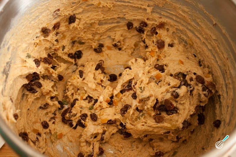Adicione as frutas à massa e volte a bater, somente para incorporar. Modele em forma de bola, coloque em uma tigela untada e enfarinha e deixe descansar por mais 30 minutos.