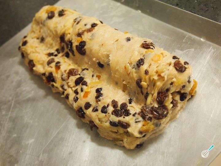 Em seguida modele a massa do stollen no formato original: abra em forma de retângulo numa superfície untada, enrole em rocambole uma das metades e alise, para ficar perfeitinho. Coloque na assadeira e deixe descansar por mais 20 minutos.